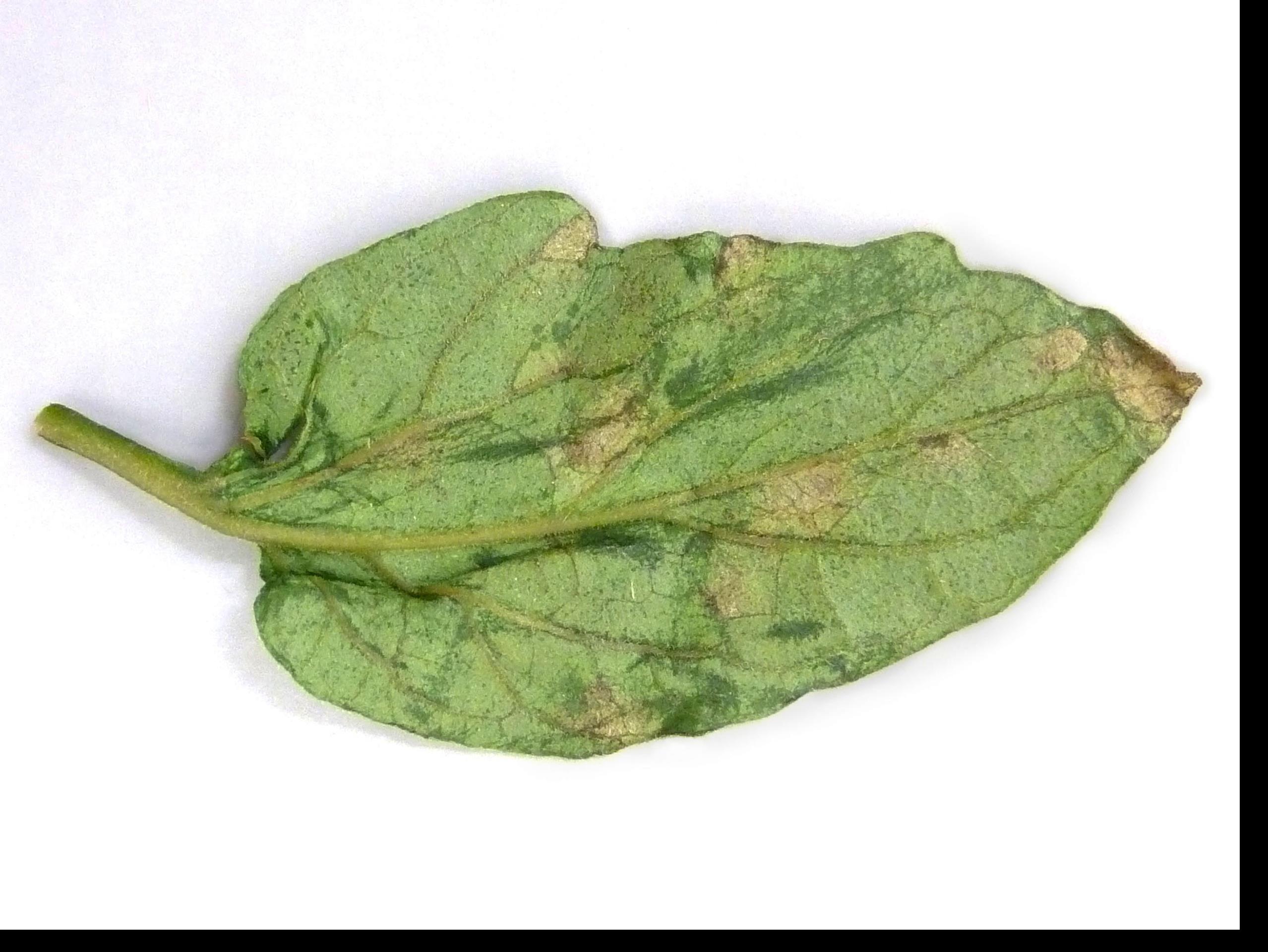 À la face inférieure d’une feuille de tomate de serre (cv 'Komeet'), présence d’un duvet blanchâtre à jaunâtre vis-à-vis des taches brunes observées à la face supérieure. Les observations microscopiques ont révélé la présence de spores du champignon Leveillula taurica, responsable d’une forme d’oïdium (blanc) chez la tomate.