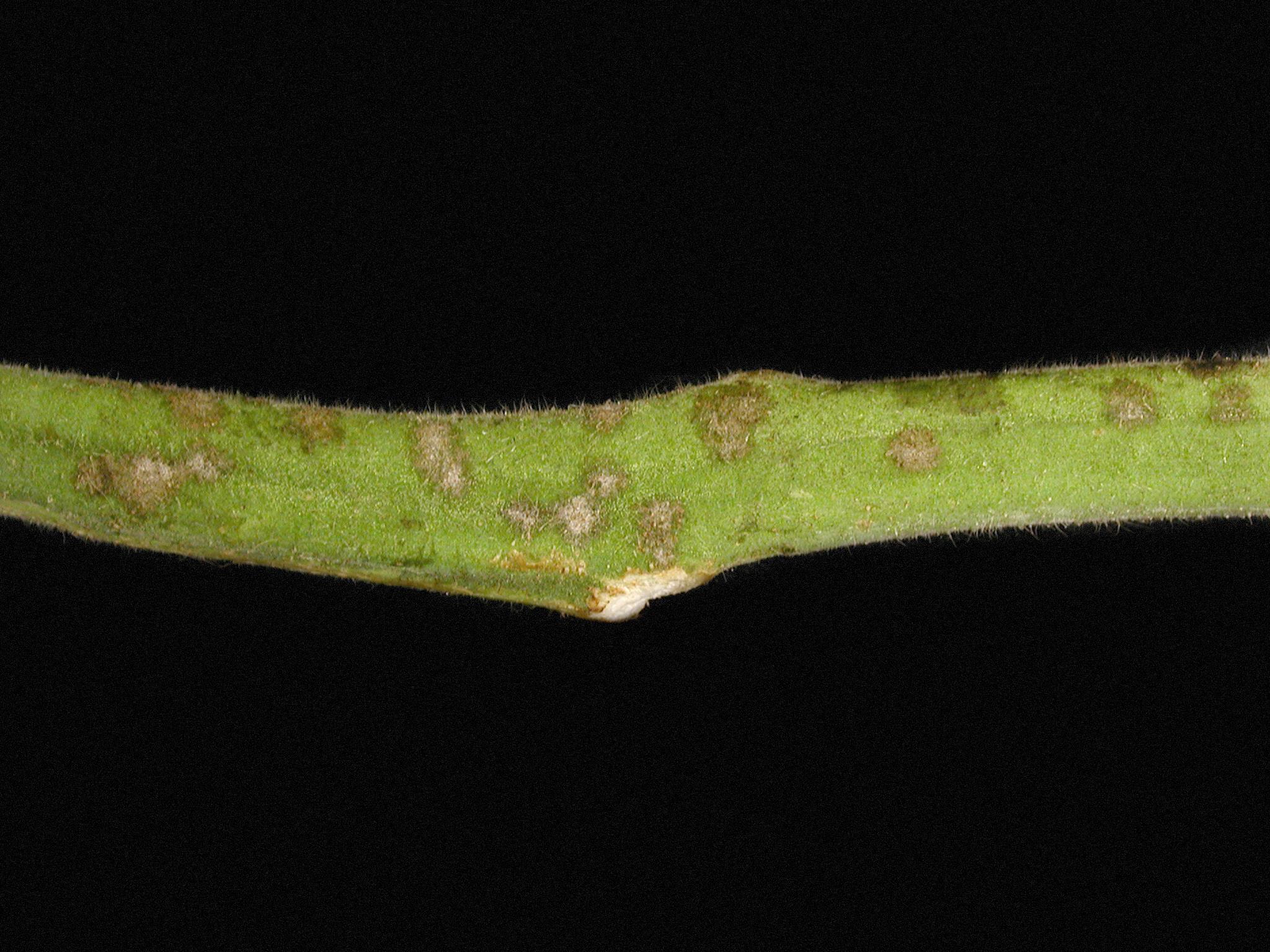 Sur une tige de tomate de serre, présence de taches circulaires ayant une coloration blanchâtre au centre avec une marge verdâtre aqueuse. Elles sont réparties le long de la tige, mais seulement d’un côté. Les observations microscopiques ont révélé la présence de spores du champignon Oidium neolycopersici, responsable du blanc chez la tomate.