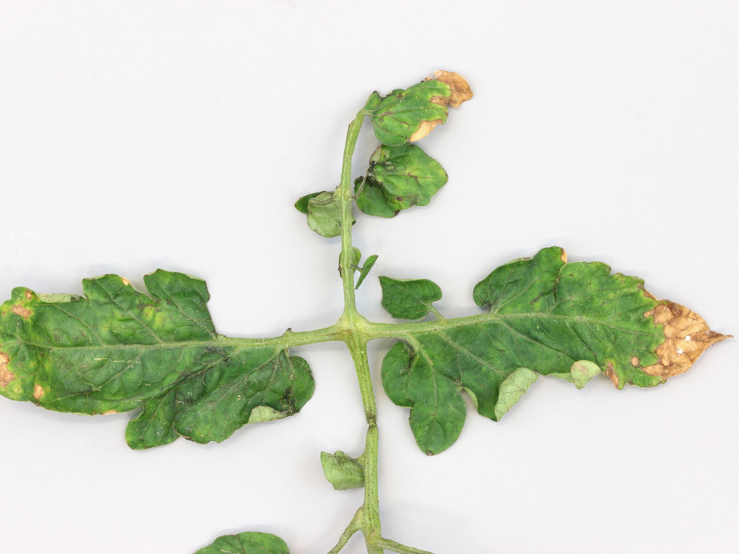 Des folioles de tomate de serre (cv 'Conchita') montrent une mosaïque jaune et vert pâle et des brûlures beiges débutant à l’apex et progressant à la marge. Le limbe est réduit, gaufré et enroulé près de la marge. Les tests de laboratoire ont révélé la présence du virus Y de la pomme de terre (PVY).