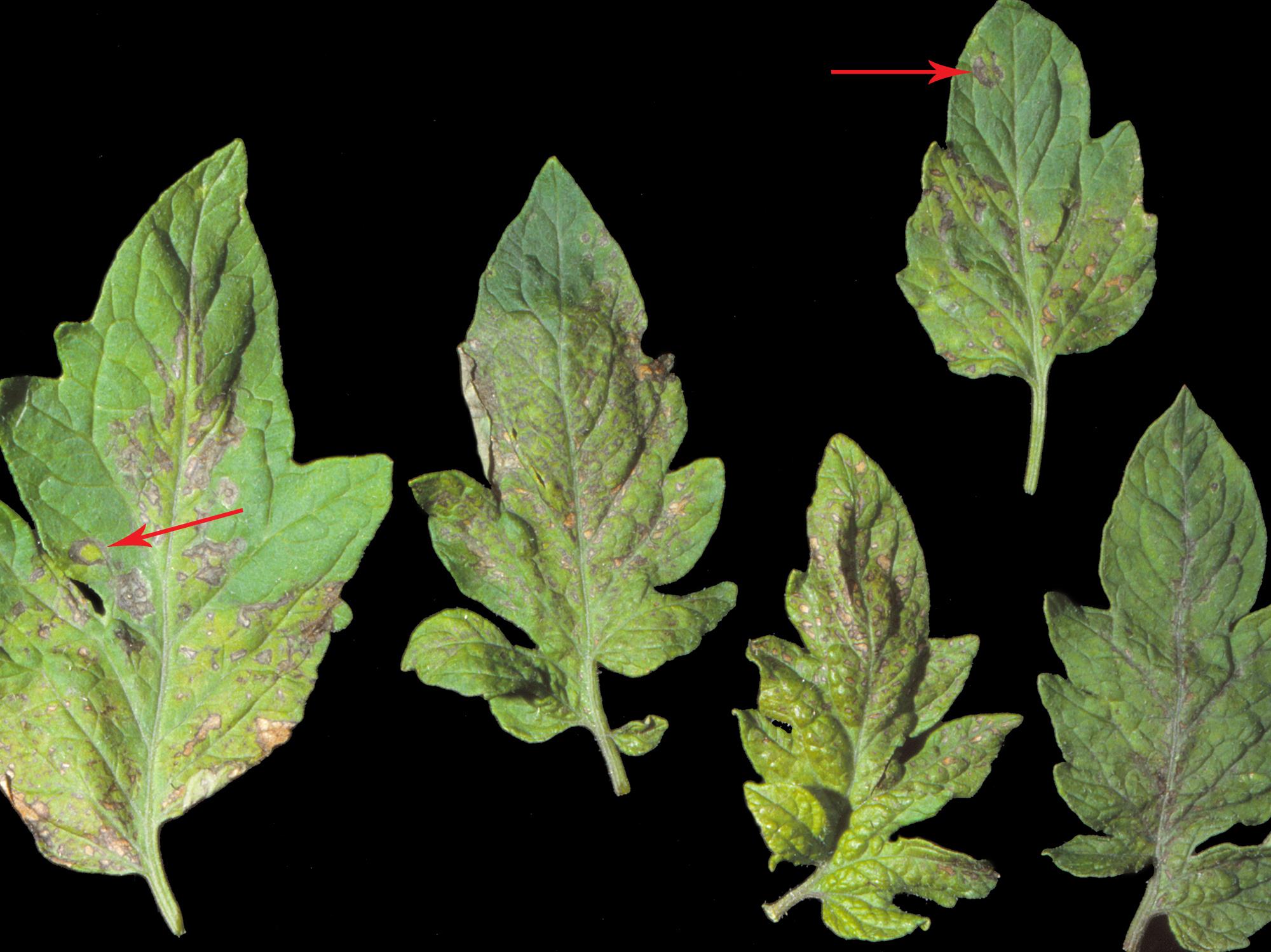 Des folioles de tomate de serre montrent de nombreuses taches ou brûlures angulaires brunes, localisées entre les nervures et distribuées aléatoirement sur le limbe. Quelques taches en anneaux sont observées (voir flèches). Les tests de laboratoire ont révélé la présence du virus de la maladie bronzée de la tomate (TSWV).