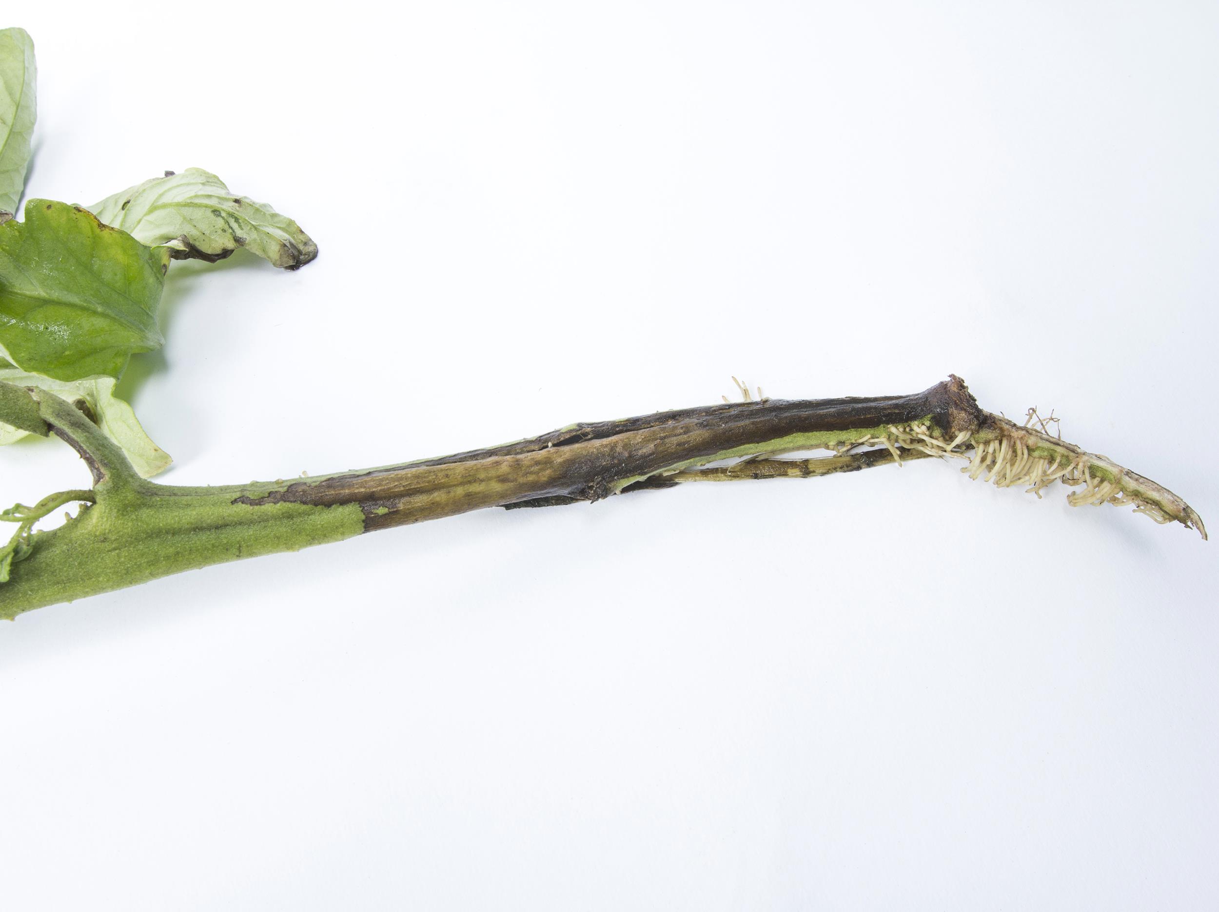 Une vue rapprochée d’une tige de tomate de champ (cv 'Prima Red') montre des racines adventives et un chancre brun à noir dans lequel les tissus s'affaissent. Le chancre progresse vers le haut. Les feuilles localisées dans les zones supérieures aux chancres sont jaunes et flétries (non visible ici). Les tests de laboratoire ont révélé la présence de la bactérie Pseudomonas corrugata, responsable de la moelle noire chez la tomate.