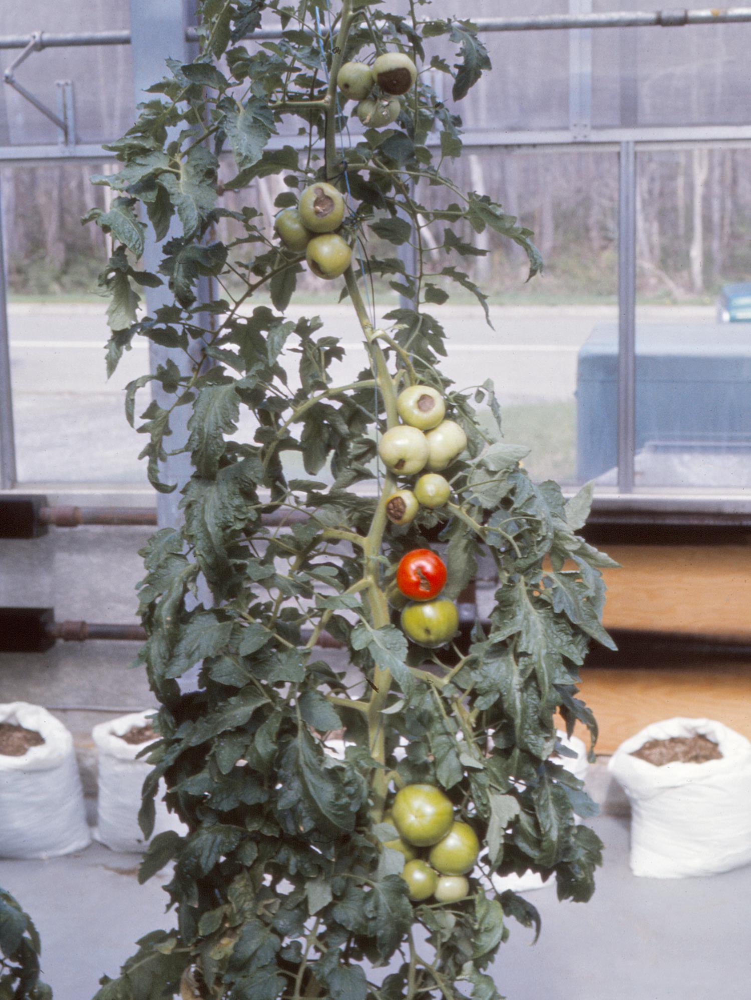 Ce plant de tomate de serre montre plusieurs grappes de fruit avec une zone renfoncée brunâtre, sèche et ferme, à l’apex de la majorité des fruits. Ce symptôme est caractéristique de la pourriture apicale chez la tomate. Elle est causée par une carence en calcium.