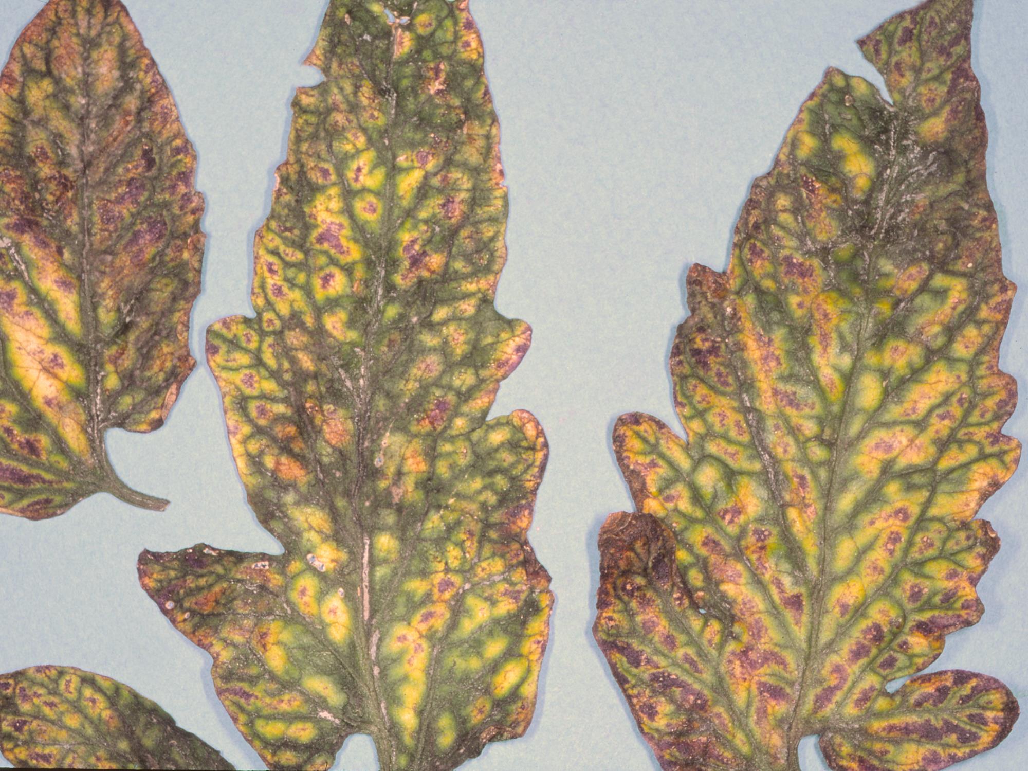 Quelques folioles de tomate de serre montrent différentes anomalies de coloration (jaune, orange, mauve) entre les nervures principales qui demeurent vertes. Aucun agent pathogène n’a été détecté des dommages. Comme tous les plants de la serre présentaient ces anomalies de coloration, l’hypothèse la plus plausible pour expliquer les symptômes repose sur une sévère carence en magnésium.