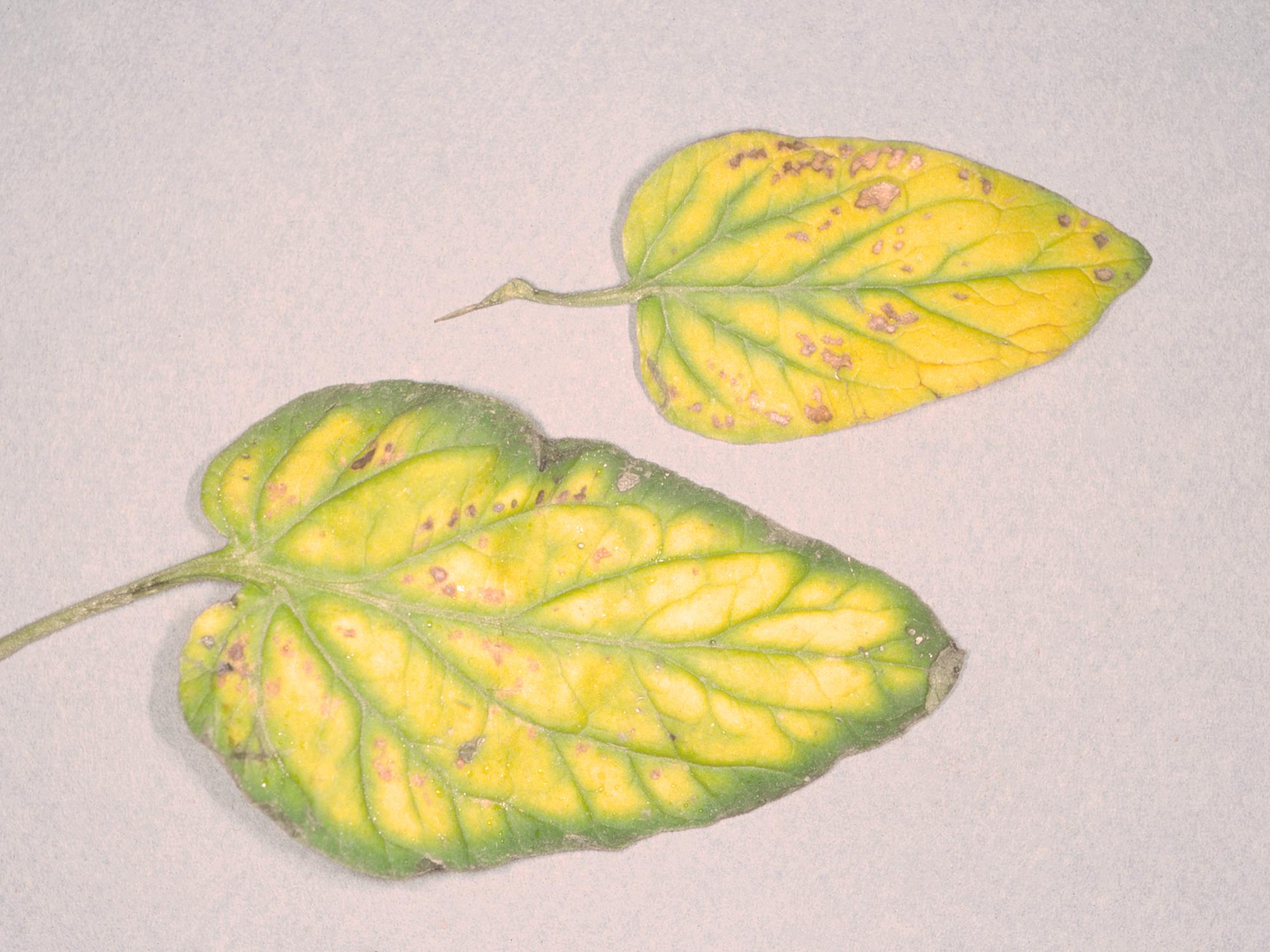 Deux folioles de tomate de serre (cv 'Rapsody') montrent un jaunissement prononcé entre les nervures principales qui demeurent vertes. De petites brûlures apparaissent entre les nervures. La marge montre une ligne verte. Ces symptômes sont caractéristiques d’une carence en magnésium chez la tomate.