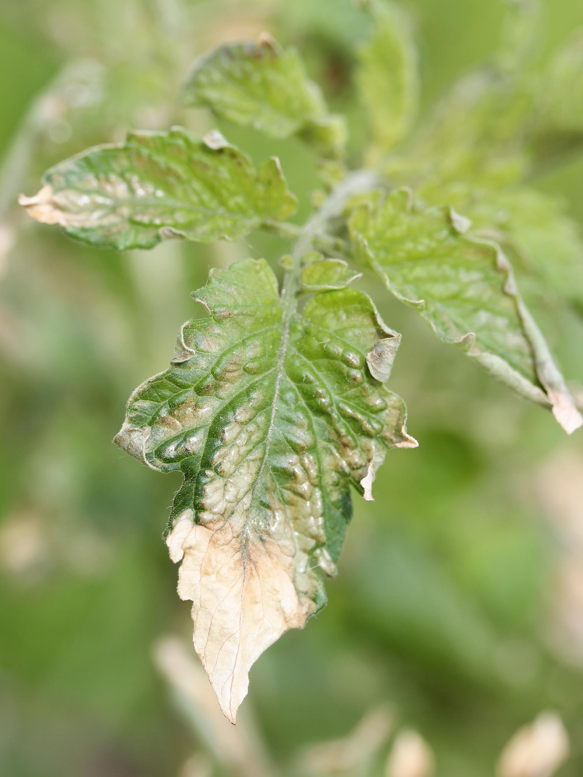 Ces folioles de tomate de champ montrent un blanchiment et un brunissement discret du limbe. Tous les niveaux de feuilles étaient touchés. Ces symptômes sont attribuables à du gel printanier survenu au début du mois de juin.
