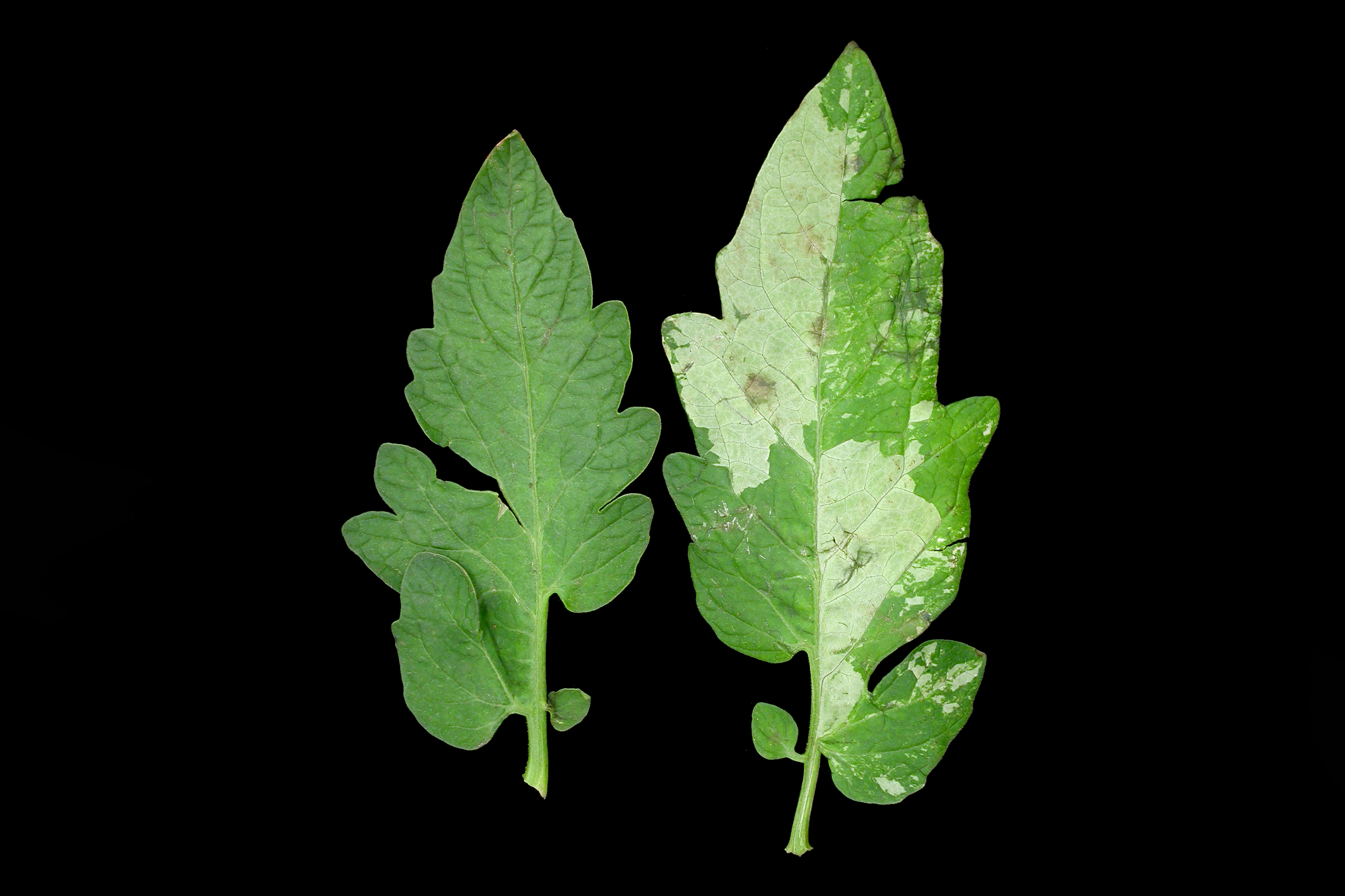 Comparaison entre une foliole de tomate de serre (cv 'Westland') saine et affectée. La foliole affectée montre de grandes plages vert grisâtre, dont la marge est bien délimitée des tissus sains, et occupant presque la moitié du limbe. Aucun virus n’a été détecté des dommages. Ce symptôme est caractéristique d’un désordre génétique appelé argenture.