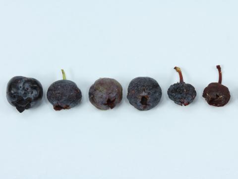 Fruits de bleuetier dans lesquels des larves de Pseudanthonomus seriesetosus se développent. Dans le bleuet de gauche, on observe les trous causés par la femelle lors de son alimentation et lors de la ponte des oeufs. Les autres bleuets de la photo présentent différents degrés de dessèchement dû à la présence des larves s'alimentant à l'intérieur du fruit.