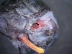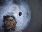 Un bleuet présentant un trou en surface qui se prolonge en galerie dans la chair. Des excréments sont aussi observables. Plusieurs espèces sont susceptibles de causer ce type de dommages, notamment les tordeuses Grapholita packardi et Grapholita prunivora.