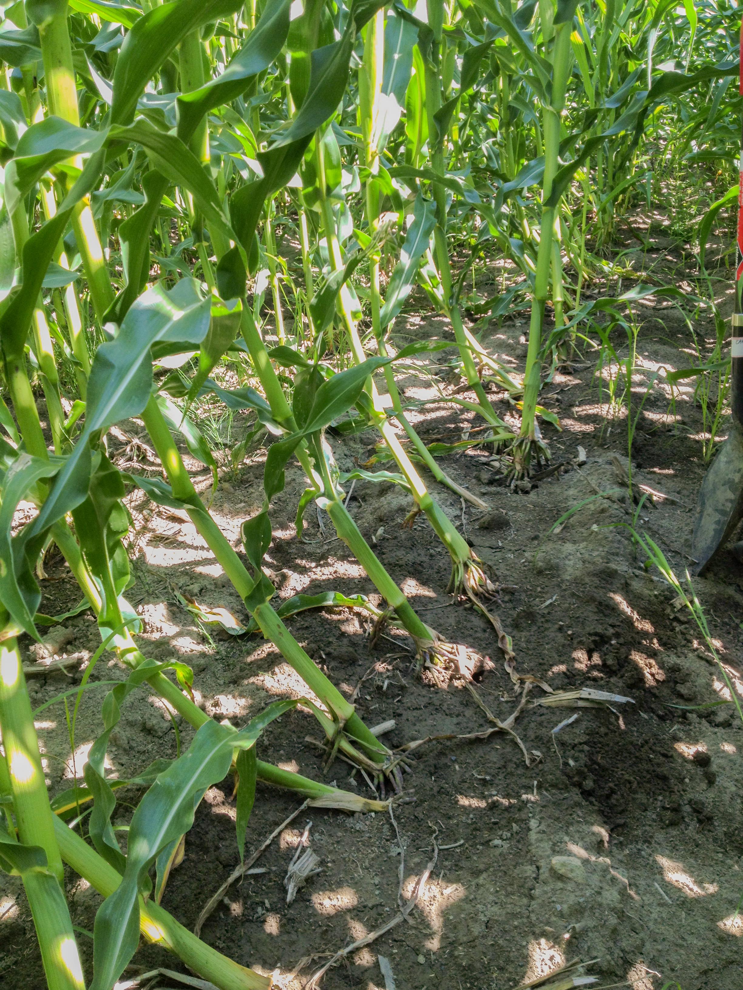 Des plants de maïs avec la tige recourbée en forme de col de cygne, symptôme résultant des dommages causés par des chrysomèles des racines : les larves se nourrissent presque exclusivement de racines de maïs. Les jeunes larves grignotent les radicelles alors que les larves plus âgées creusent des galeries dans les racines d'ancrages. Les plants endommagés sont alors susceptibles de pencher ou de verser. Certains plants prennent alors la forme d'un col de cygne lorsqu'ils se courbent vers le haut dans un effort pour se redresser. Les larves transmettent les Fusarium des racines.