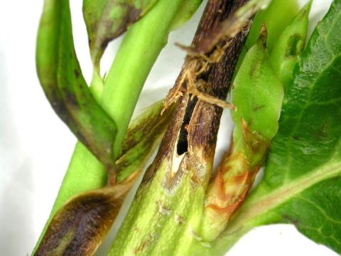 Portion d'une tige de bleuetier présentant des dégâts causés par la larve d'Hendecaneura shawiana. Celle-ci creuse une galerie mesurant de 20 à 25 cm de l'apex vers la base de la tige. Les dégâts sont observés en juillet. D'autres espèces appartenant au genre Recurvaria spp. occasionnent des dégâts semblables. Dans ce cas, les dommages surviennent au printemps et les galeries sont plus courtes (environ 5 cm).
