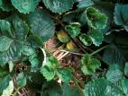 Feuillages de fraisier présentant des dommages causés par l'alimentation de tarsonèmes du fraisier. Ces acariens s'attaquent d'abord aux jeunes feuilles au coeur du plant. En plus d'induire un retard de croissance, les feuilles deviennent crispées, recroquevillées et d'aspect terne, jauni ou rougeâtre. Il en découle parfois un stress diminuant la productivité des plants ou augmentant leur sensibilité aux stress hydriques.