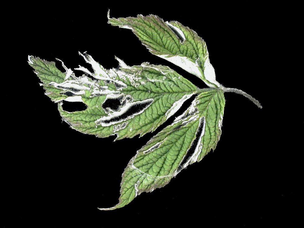 Face supérieure d'une feuille de framboisier présentant des dommages causés par des larves squeletteuses de la famille des Schreckensteiniidés. Les larves grugent l'épiderme supérieur de la feuille, ce qui entraîne la formation de chapelets de zones blanchâtres caractéristiques entre les nervures principales. Parfois, il y a formation de trous tels que sur la photo. Lors de fortes infestations, toute la surface de la feuille peut être affectée.