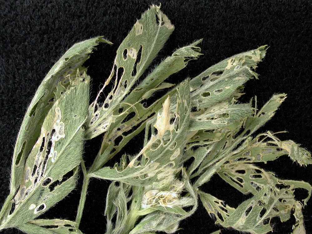 Feuilles de luzerne présentant de dommages causés par l'espèce Hypera postica : les larves grignotent les feuilles, formant ainsi des trous irréguliers dans le feuillage.