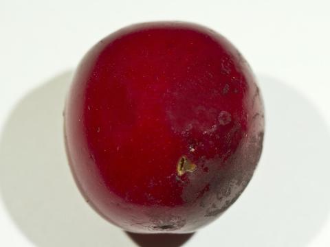 Cerise présentant une cicatrice de ponte du charançon de la prune : la cicatrice se caractérise par sa forme d'ancre. Cette cicatrice est causée par le comportement de la femelle qui perce une ouverture de forme particulière avant de déposer ses oeufs directement dans la chair du fruit.