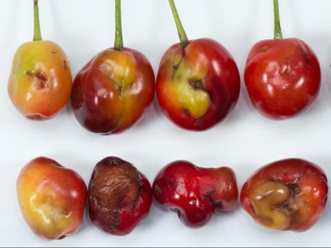 Plusieurs cerises présentant différents symptômes causés par le charançon de la prune : les cerises dans lesquelles des larves se sont développées avec succès présentent divers niveaux de déformation. Certains fruits pourrissent prématurément tandis que d'autres vont présenter des anomalies de coloration et un fendillement au niveau de la pelure. Une forte proportion des fruits affectés tombe avant d'avoir atteint la maturité.