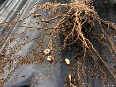 Dommages causés par des vers blanc dans un champ de camérisiers.