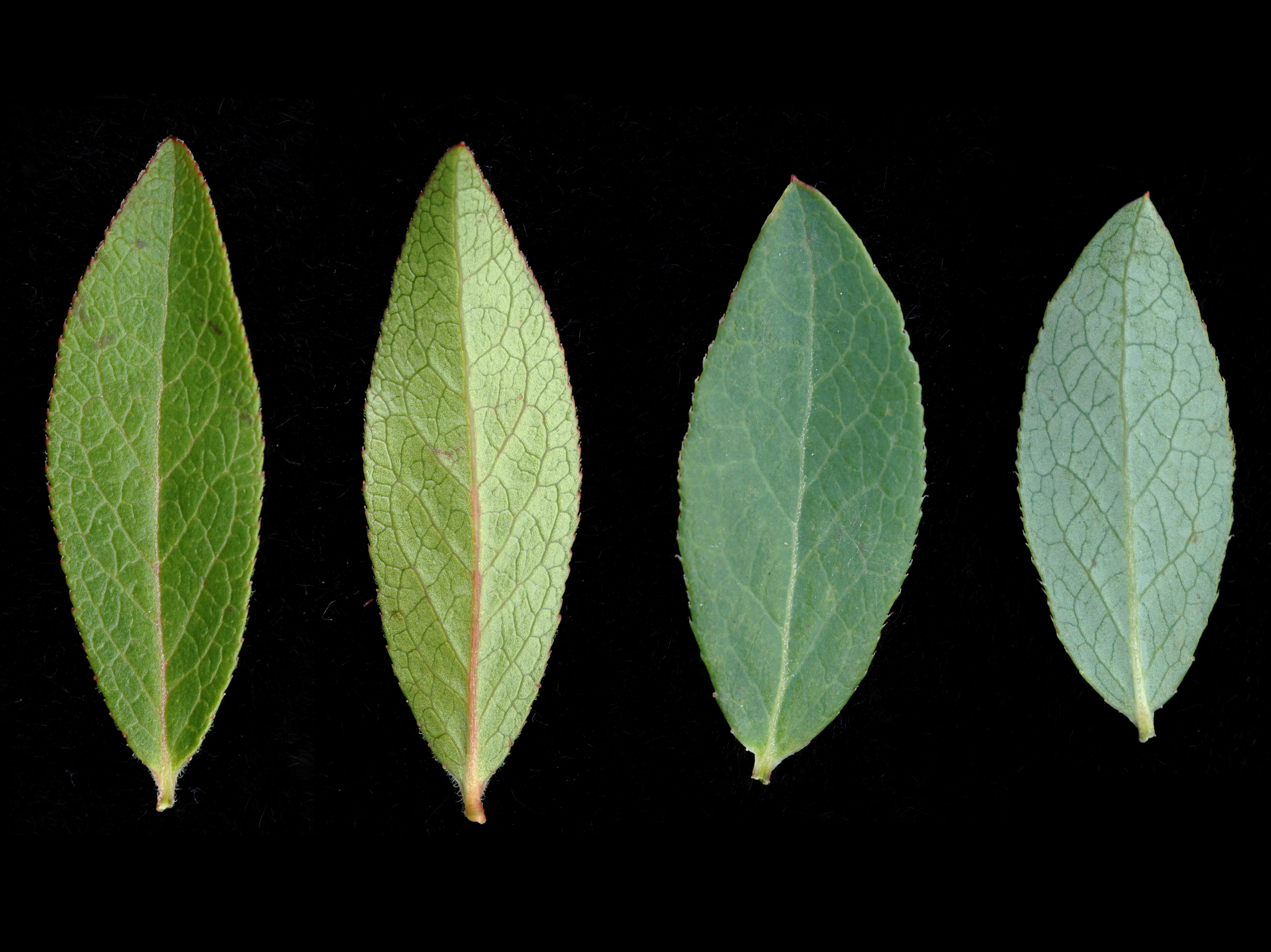 Feuilles types face supérieure et face inférieure, variété à fruits pruineux (gauche) et variété à fruits noirs (droite)