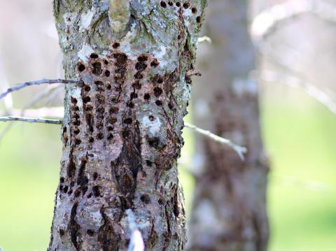 Sur cette photo, on observe de petits trous ovales, réparties en file horizontale. Ce tronc d’argousier mature est fortement affecté par le pic maculé. Les perforations faites par l'oiseau empêchent la sève de bien circuler dans l'arbre. On remarque même un étranglement au niveau de la zone affectée. Il souffrira de ces blessures de manière permanente.