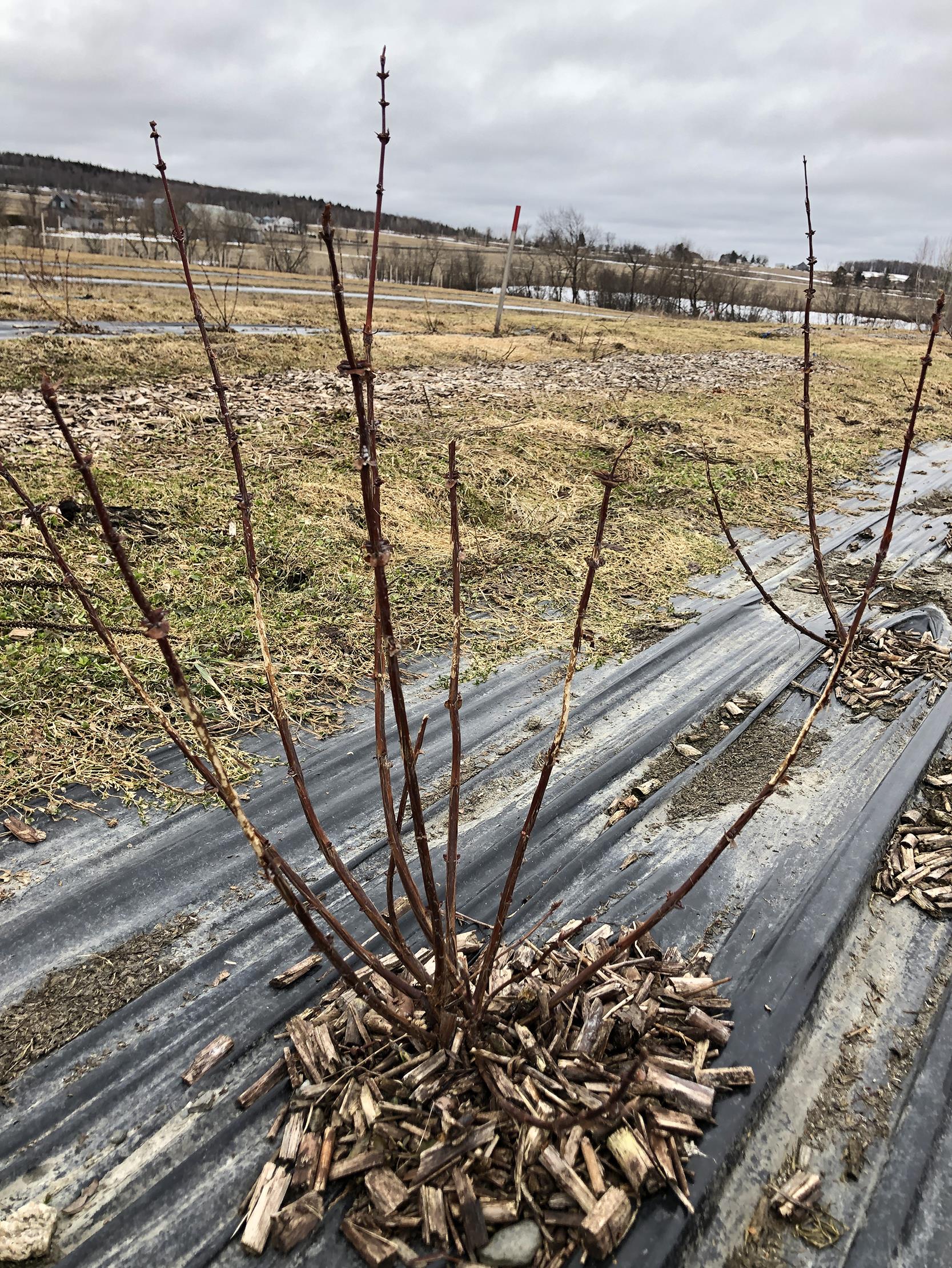 Tiges de camérisier grugées durant l’hiver par des campagnols. Les plants sont à proximité de hautes herbes où le couvert de neige était important, conditions qui favorisent l’habitat hivernal du petit mammifère. De petites traces de dents sont visibles sur le bois, signe du passage de campagnols.