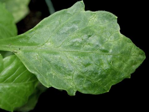 Une feuille de dahlia présente un limbe gaufré et une mosaïque constituée de plages irrégulières jaunes. Les plants présentaient du nanisme (non visible ici). Les tests de laboratoire (test ELISA) ont révélé la présence du virus de la mosaïque du tabac (TMV).