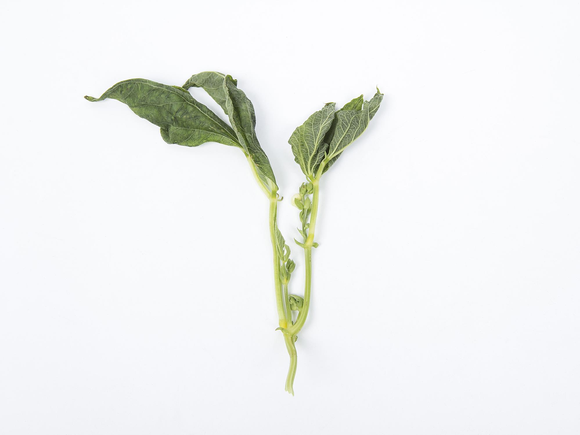 Des folioles de haricot sont déformées. Elles montrent du bossellement, une marbrure du limbe allant du vert foncé au vert pâle, les nervures sont déformées et la marge peut être courbée vers le haut. Les jeunes feuilles sont les plus affectées. Les tests de laboratoire ont révélé la présence du virus de la mosaïque du concombre (CMV).