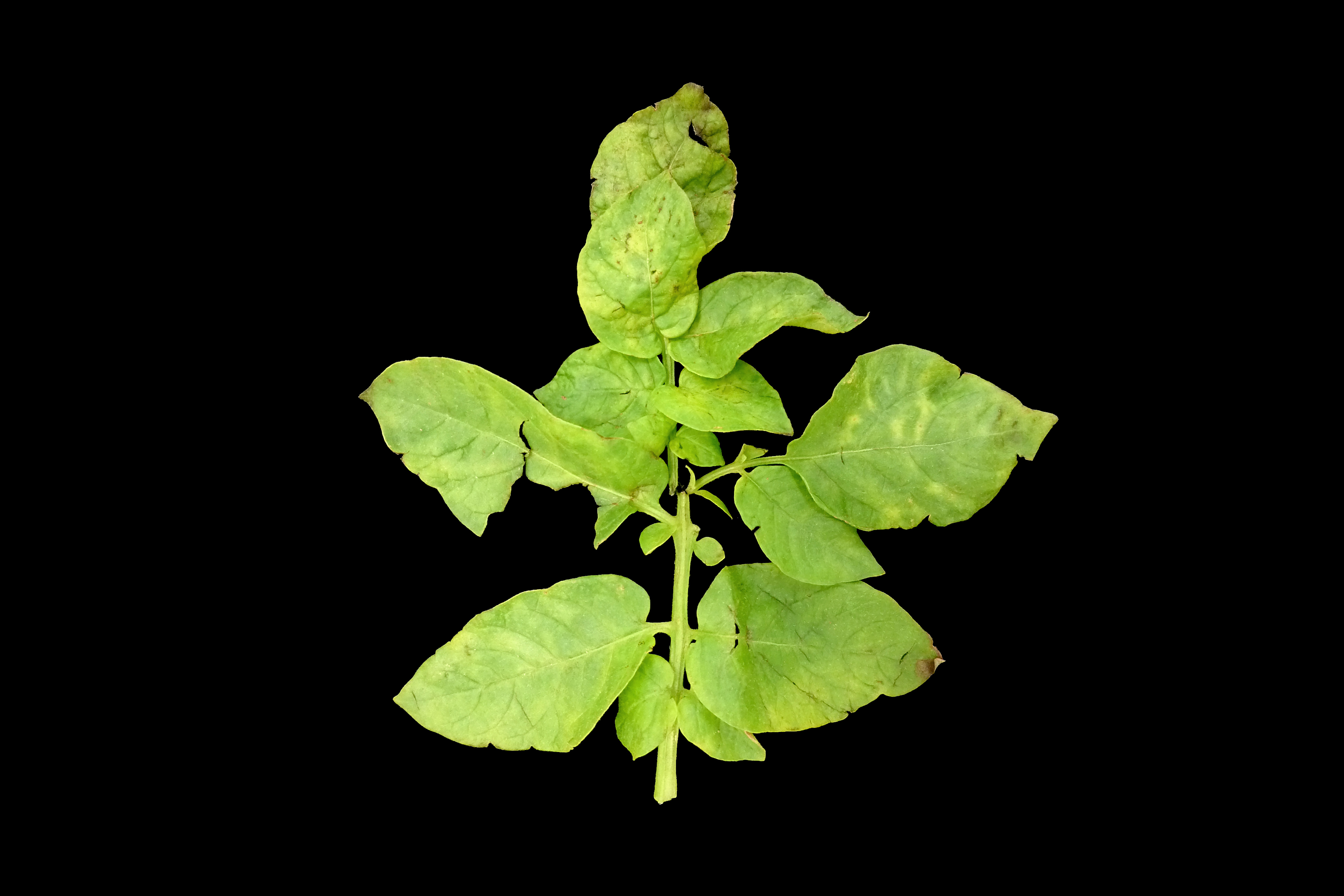 Une feuille affectée de pomme de terre (cv 'Goldrush') montre des folioles déformées qui ont une mosaïque jaune et vert pâle et quelques taches nécrotiques. La feuille est petite lorsque comparée à une feuille saine (non visible ici). Les tests de laboratoire ont révélé la présence du virus de la mosaïque de la luzerne (Alfalfa Mosaic Virus (AMV)).