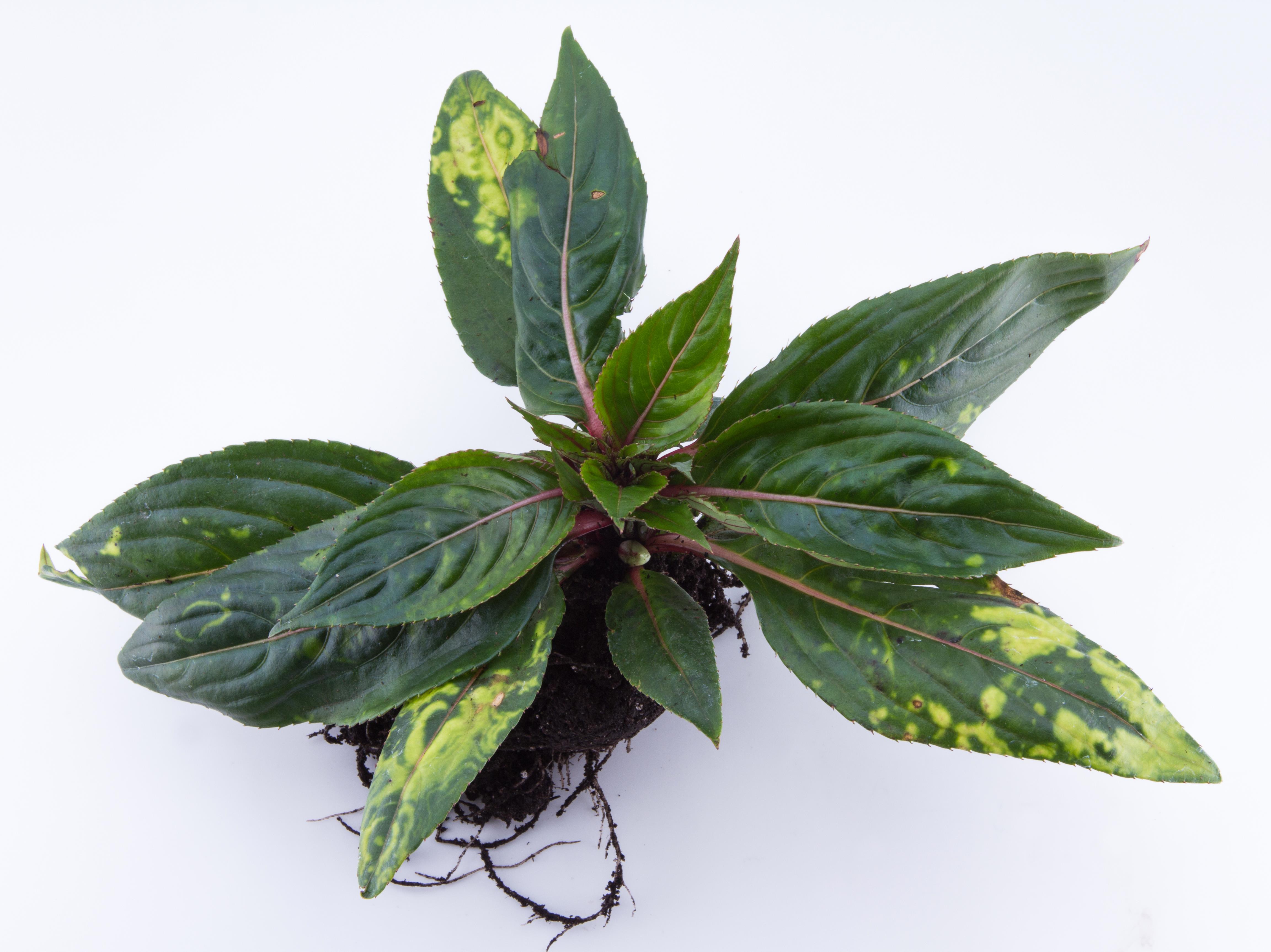 Un plant d’impatiente de Nouvelle-Guinée (cv 'Celebrette Pink') montre des marbrures sur les feuilles. Des anneaux sont présents dans les régions qui portent des marbrures. Les feuilles basales et médianes sont affectées. Les tests de laboratoire (test ELISA) se sont avérés négatifs pour la détection de virus (19 virus testés). Seuls quelques plants de cette variété avaient ces symptômes.