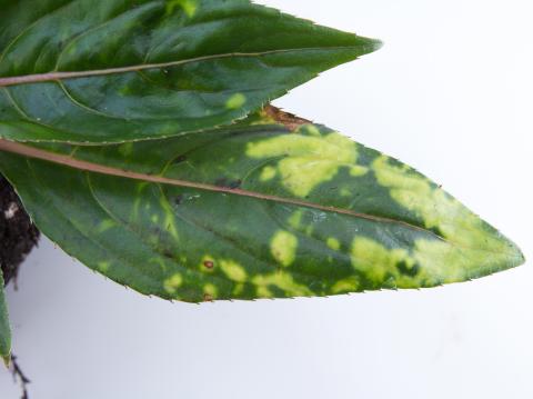 Une vue rapprochée d’une feuille d’impatiente de Nouvelle-Guinée (cv 'Celebrette Pink') montre des marbrures sur les feuilles. Des anneaux sont présents dans les régions qui portent des marbrures. Les feuilles basales et médianes sont affectées. Les tests de laboratoire (test ELISA) se sont avérés négatifs pour la détection de virus (19 virus testés). Seuls quelques plants de cette variété avaient ces symptômes.