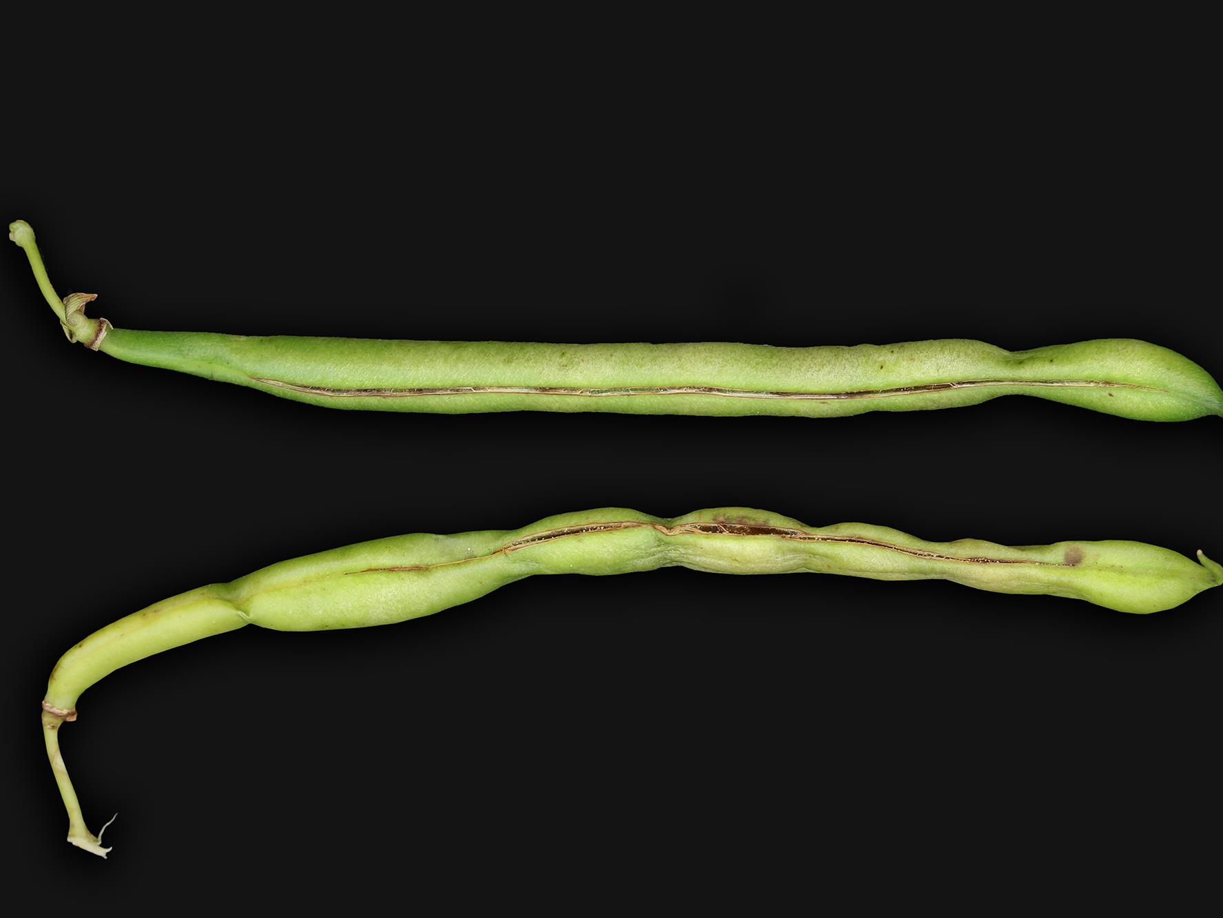 Des gousses de haricot vert (cv 'Ferrari') sont déformées. Elles s'ouvrent et sont brunies au niveau de la suture. Elles sont vert pâle. Certaines feuilles ont des mosaïques jaune-vert (non visible ici). Les tests de laboratoire ont révélé la présence du virus de la mosaïque du concombre (CMV).