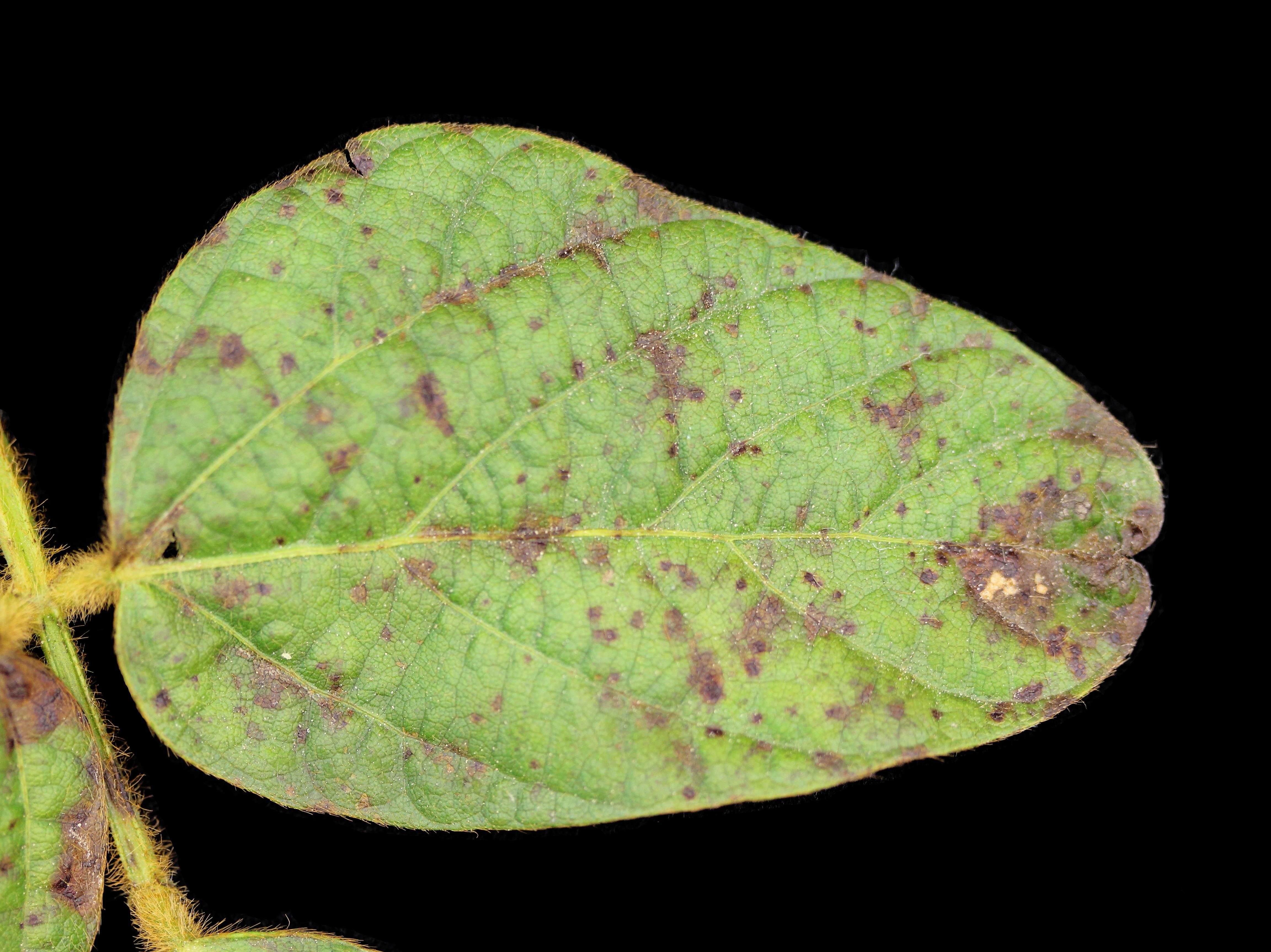 À la face inférieure d’une foliole de soya, présence de nombreuses petites taches brunes. Les taches sont distribuées aléatoirement et traversent le limbe. Les tests de laboratoire ont révélé la présence de la bactérie Xanthomonas axonopodis et du champignon Septoria glycines, responsables respectivement de la pustule bactérienne et de la tache septorienne chez le soya. Septoria et X. axonopodis causent des symptômes très semblables sur les feuilles du soya. Il est difficile d'établir lequel a eu le plus d'incidence dans le développement des taches. Ils sont probablement tous les deux impliqués.