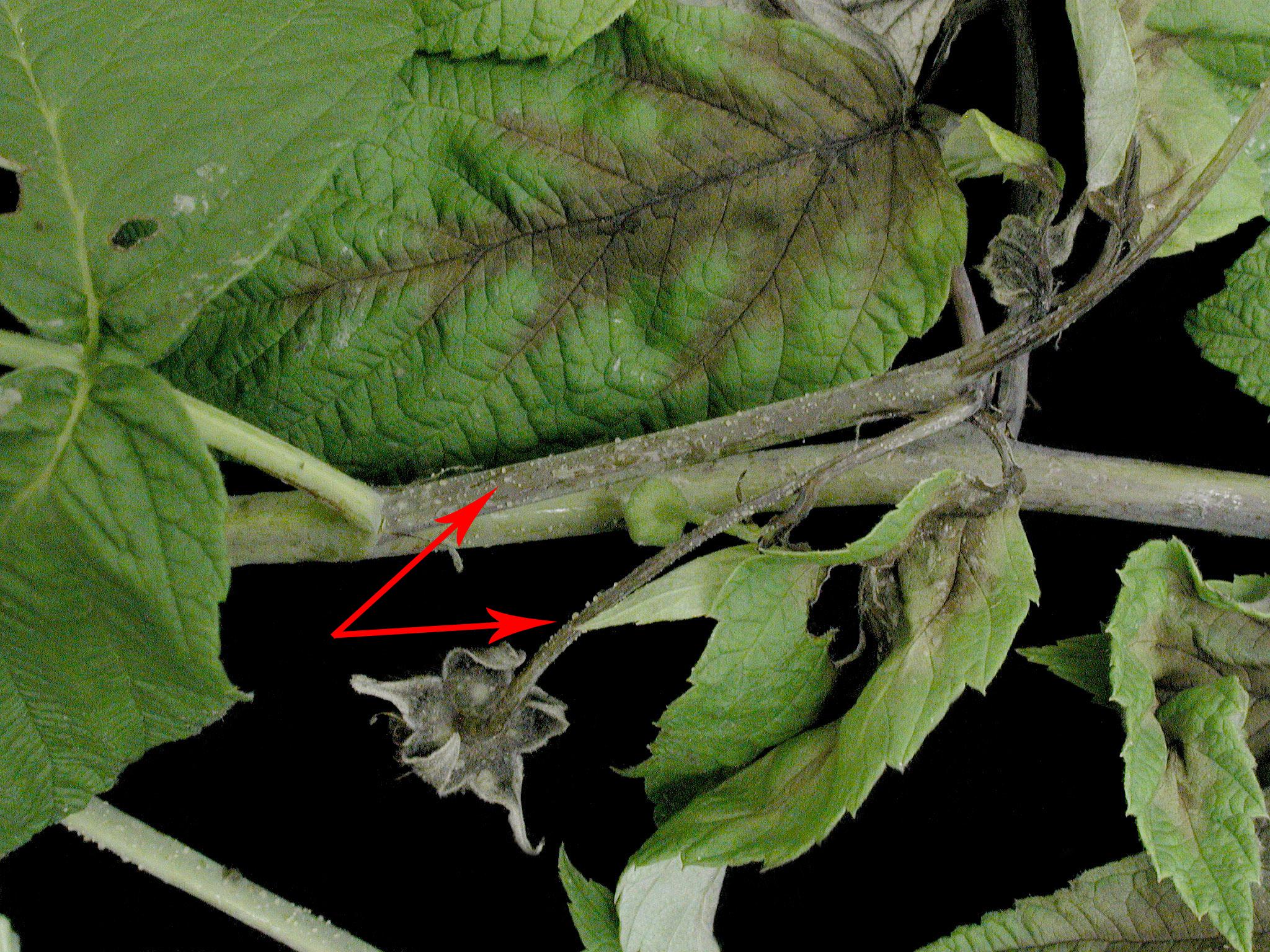 Sur les folioles de framboisier d’automne, le brunissement débute au niveau du pétiole, se propage dans les nervures qui deviennent brunes, puis le limbe bruni. Sur le pétiole des fleurs et des feuilles, des gouttelettes blanches et épaisses d'exsudats bactériens sont visibles (voir flèches). Le test de laboratoire a révélé la présence de la bactérie Erwinia amylovora, responsable de la brûlure bactérienne (feu bactérien) chez le framboisier.