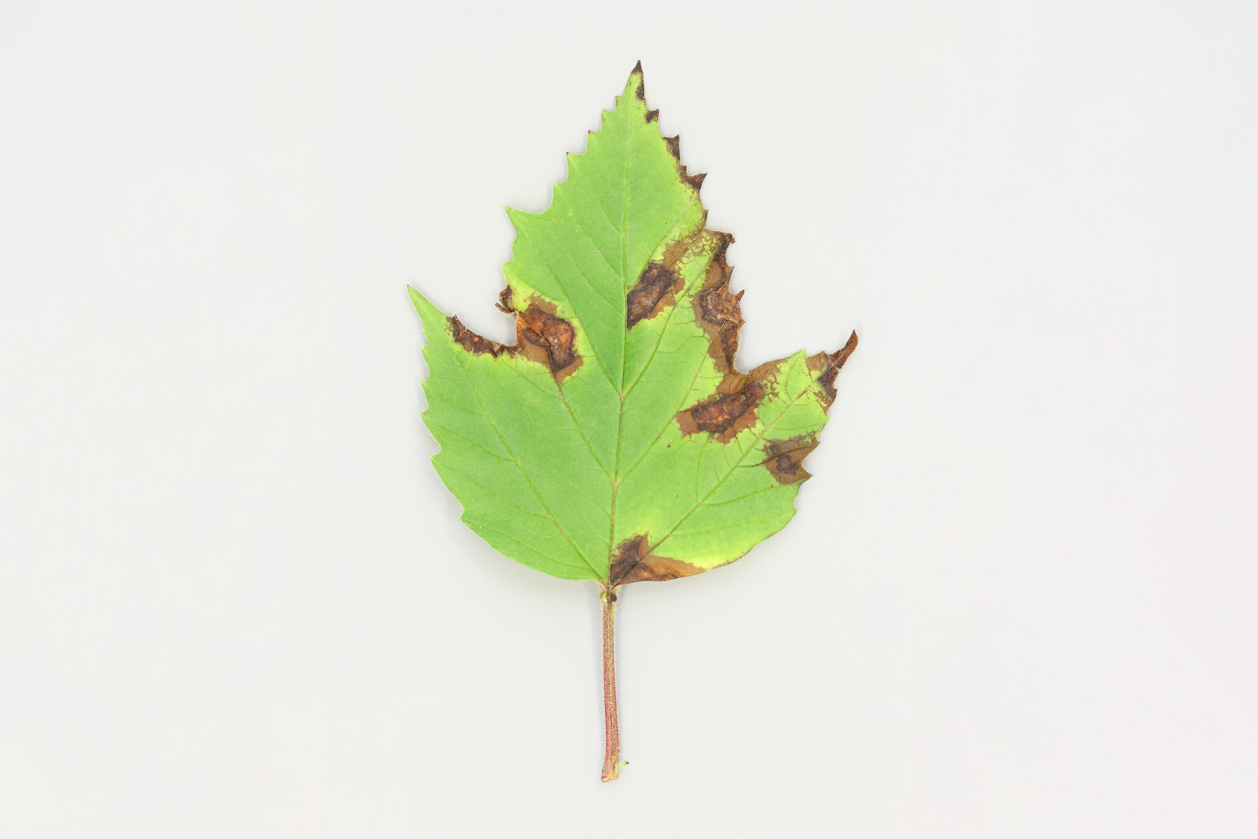 Sur un plant de viorne (cv 'Onondaga') cultivé en pépinière, une feuille montre une brûlure marginale brune et des taches irrégulières à angulaires brunes avec une marge foncée. Les tests de laboratoire ont révélé la présence de la bactérie Pseudomonas syringae, responsable de la tache bactérienne.