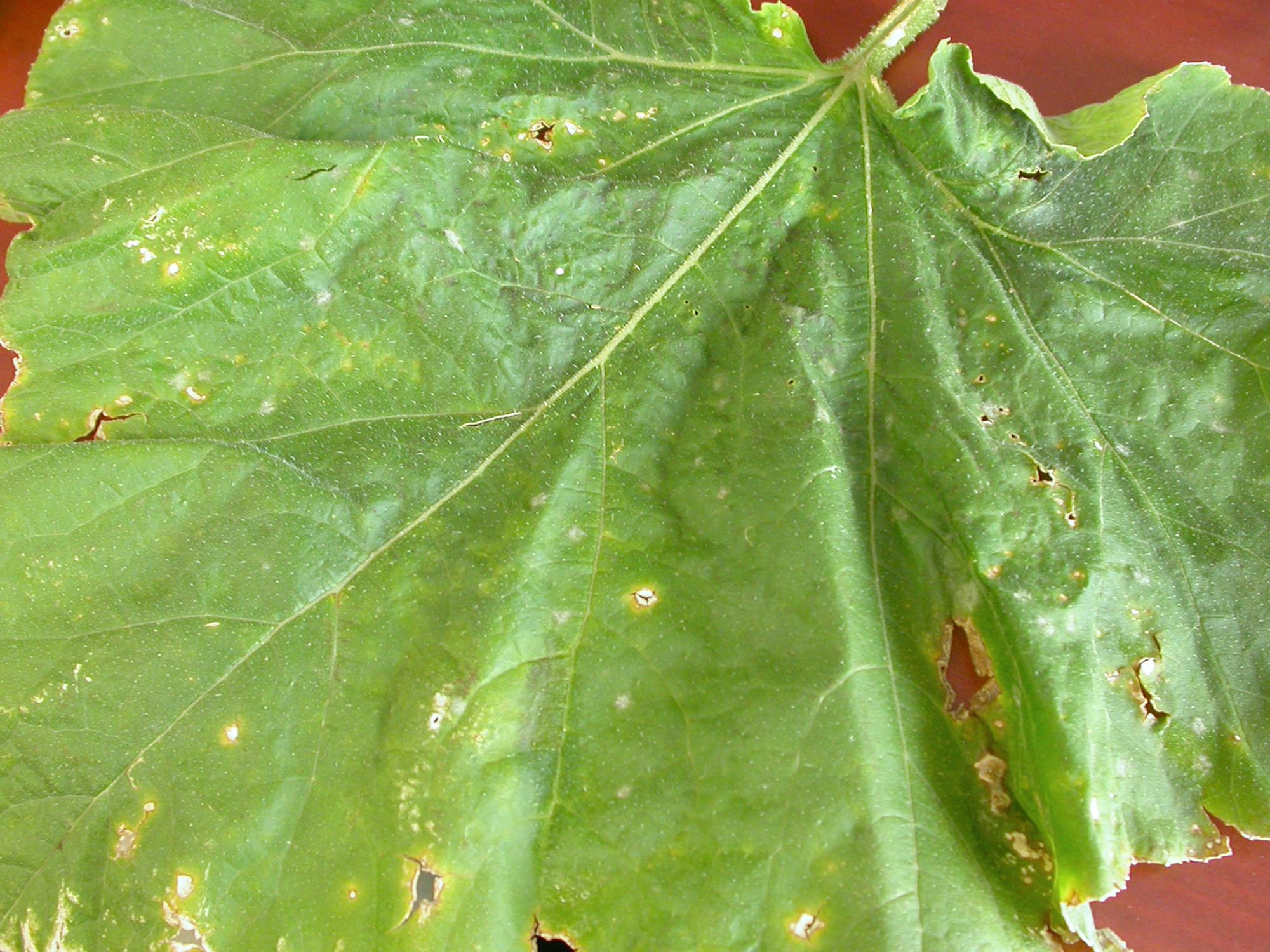 À la face supérieure d’une feuille de courge 'Buttercup' provenant d’un champ, présence de petites taches beiges à blanchâtres délimitées par une marge foncée et entourée d’un halo jaune. Les taches sont réparties aléatoirement sur le limbe. Présence d’une fine brûlure beige à la marge de la feuille. Les tests de laboratoire ont révélé la présence de la bactérie Xanthomonas cucurbitae, responsable de la tache bactérienne.