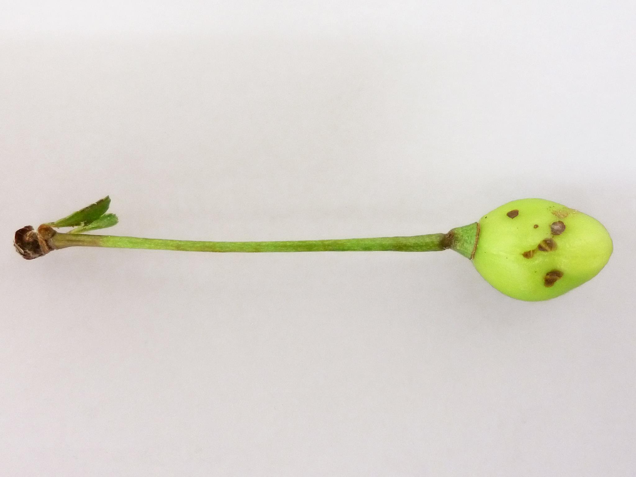 Tache causée par la coulure bactérienne sur le fruit d'un cerisier nain rustique.