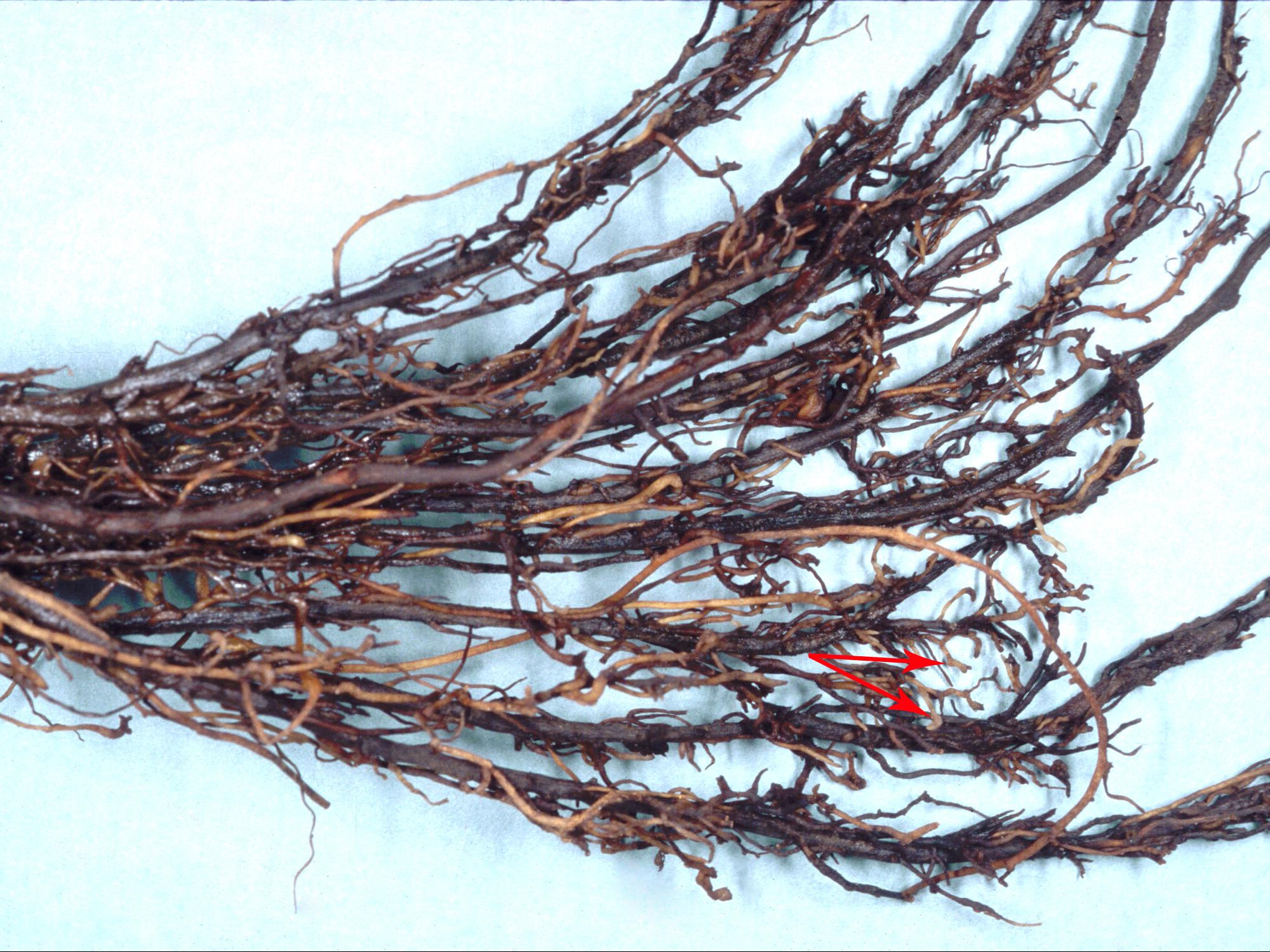 Les racines d’un fraisier (cv 'Chambly') sont brun foncé, pourries et leur extrémité est enflée (peu visible sur cette image). Les tests de laboratoire ont révélé la présence du nématode aiguille Longidorus sp. dans les racines.