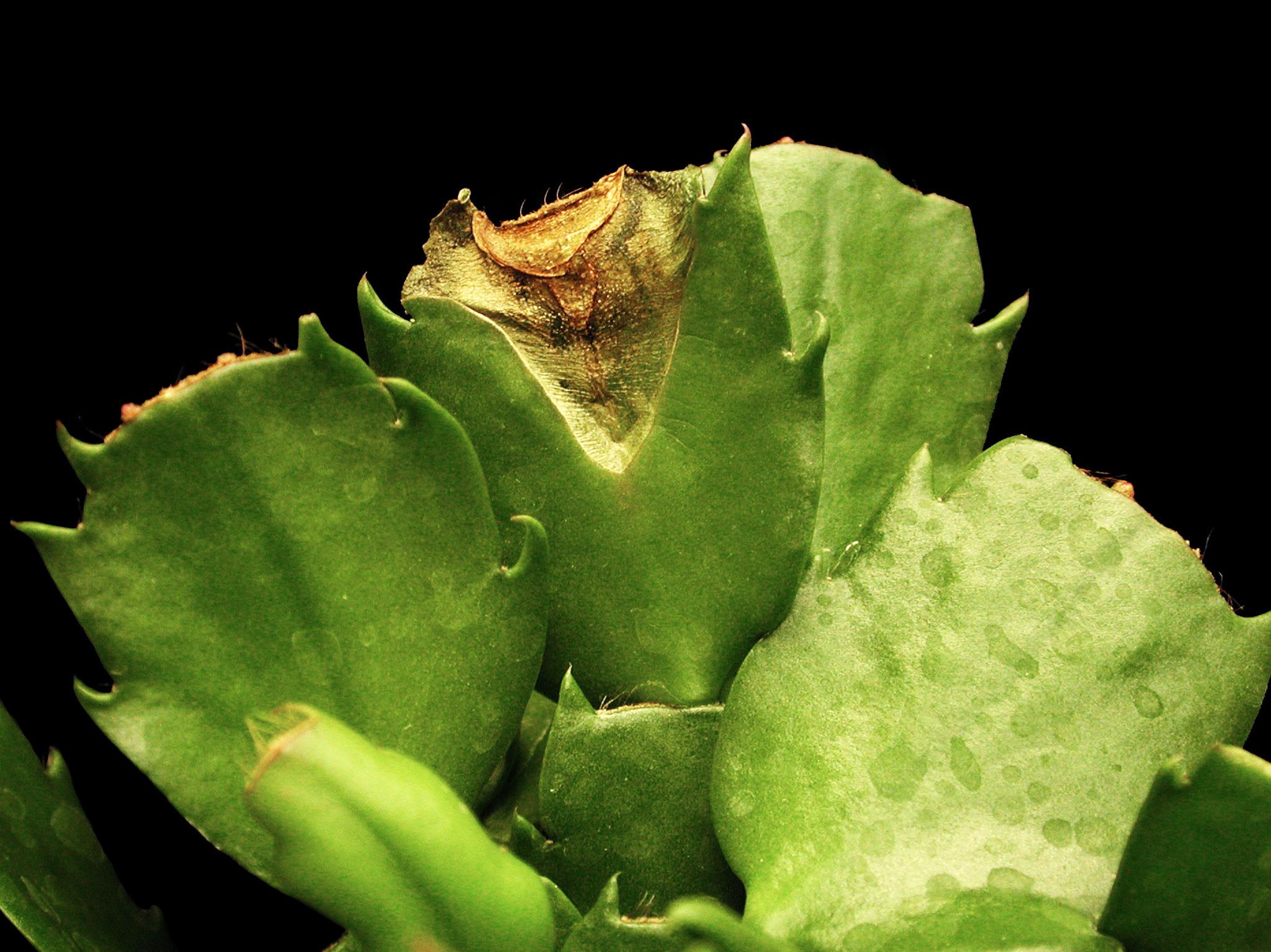 Un cladode d’un cactus de Noël montre une tache humide en forme de « V » qui progresse vers la base du limbe. Les tissus infectés en premier commencent à sécher. Les observations microscopiques ont révélé la présence du champignon Drechslera cactivora, responsable de la tache foliaire chez les cactacées.
