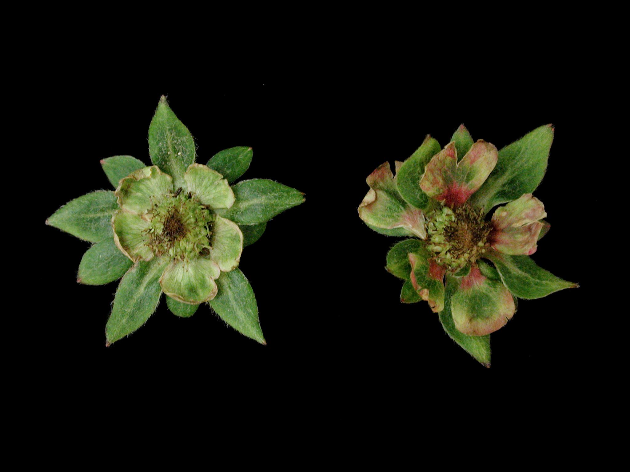 Les pétales des fleurs sont anormalement verts et d’une forme irrégulière. On remarque également que les pétales deviennent légèrement rouges. Ces déformations et la virescence sont caractéristiques du pétale vert du fraisier, une maladie causée par des phytoplasmes.