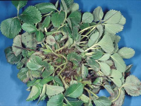 Le fraisier (cv 'Jewel') présente une importante malformation qui se caractérise par la présence de multiples collets accolés les uns sur les autres. Les feuilles sont nombreuses et petites. Ces symptômes sont caractéristiques de la maladie des collets multiples causée par un phytoplasme.