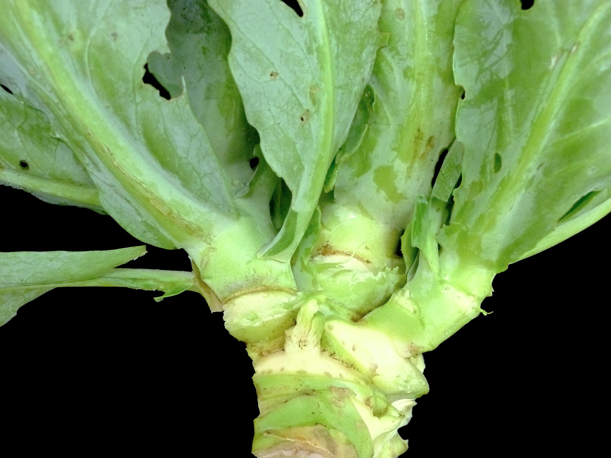 Une vue rapprochée de la base d’un chou pommé (cv 'Gretania') montre qu’elle est déformée et constituée de plusieurs petites pommes de chou au lieu d'une seule. Les tests de laboratoire (PCR) ont révélé la présence de phytoplasmes. Il pourrait s’agir du phytoplasme de la jaunisse de l’aster rapporté chez les crucifères. Dans ce cas, il y a eu perte de la dominance apicale. Chaque petite pomme de chou est intacte, mais ne sera pas commercialisable à cause de sa taille. Notez que cet échantillon provenait d'une production biologique sur un site expérimental.