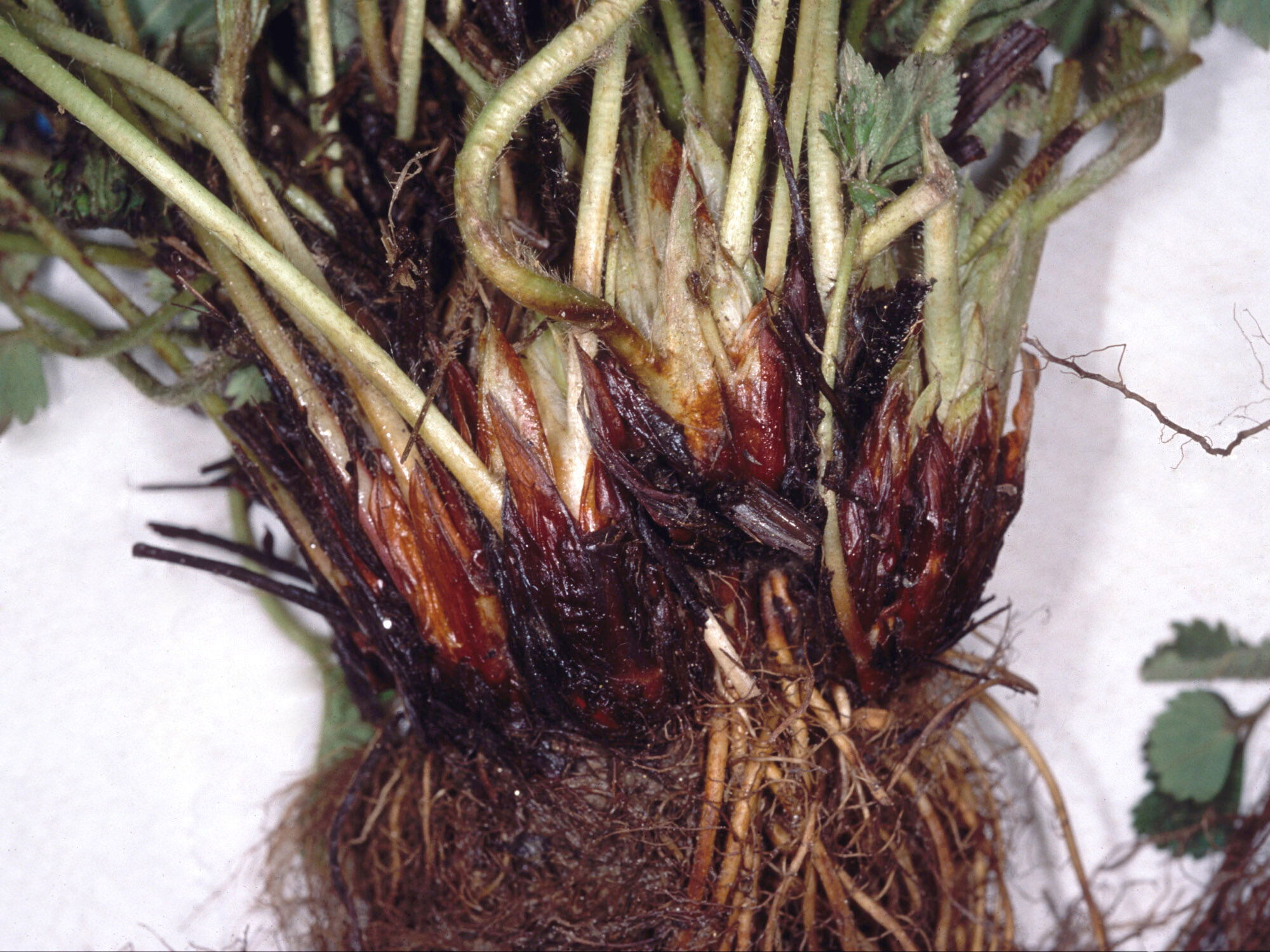 Le fraisier (cv 'Jewel') présente une importante malformation qui se caractérise par la présence de multiples collets accolés les uns sur les autres. Les feuilles sont nombreuses et petites (peu visible ici). Ces symptômes sont caractéristiques de la maladie des collets multiples causée par un phytoplasme.