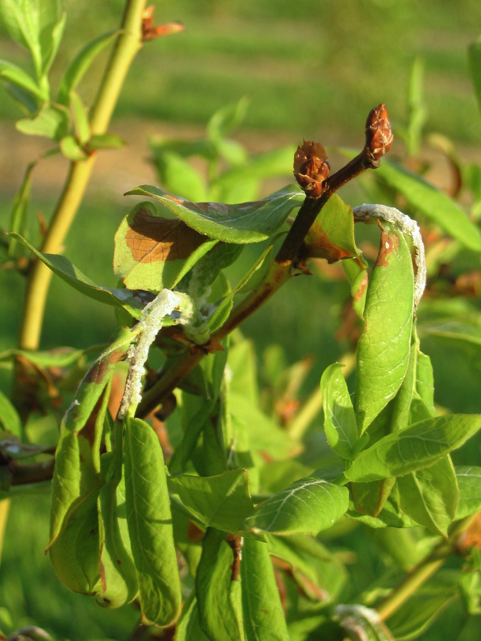 Brûlures et dépôt blanchâtre sur feuilles de bleuet en corymbe