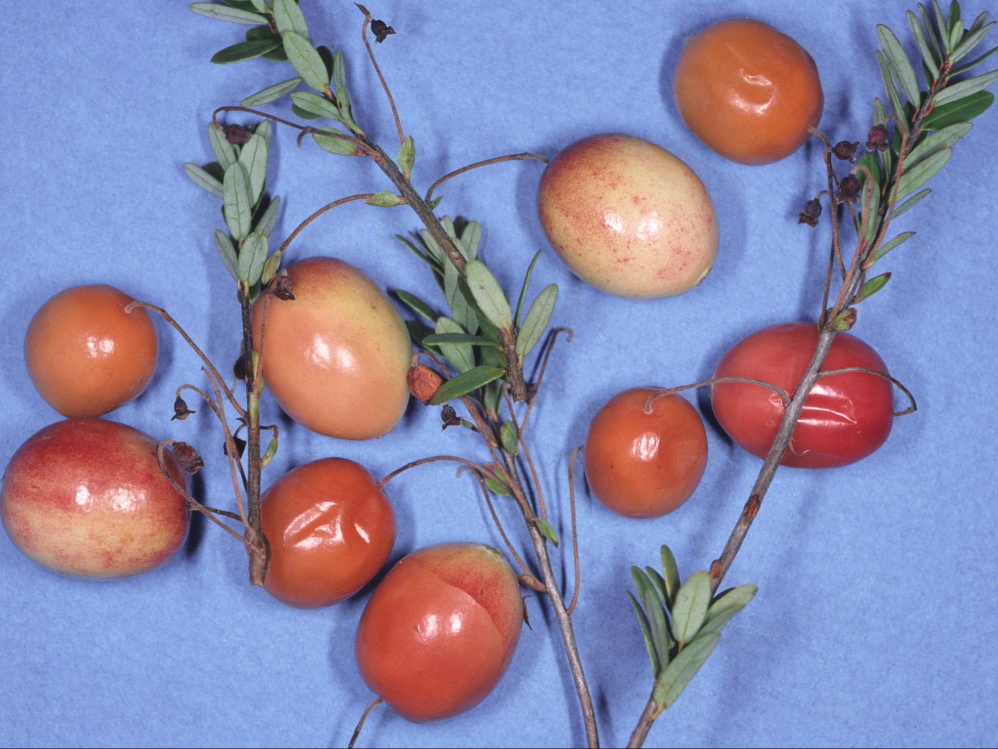 Les canneberges (cv 'Stevens') provenant d’un champ sont orange à brunes, montrent des tissus mous sur un seul côté du fruit et une pourriture de la chair (non visible ici). Les tests de laboratoire se sont avérés négatifs pour la détection de bactéries et de champignons. Sur la base des symptômes et des conditions climatiques chaudes enregistrées au cours de la saison de production, le ramollissement des fruits et la pourriture interne sont causés par une insolation (journée très ensoleillée) jumelée à une température élevée et des conditions sèches.