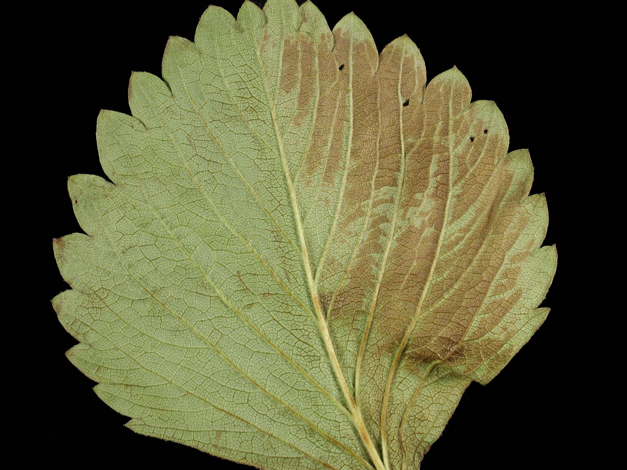 La face inférieure d’une foliole de fraisier montre du bronzage sur la moitié du limbe, mais sur un seul côté de la foliole. Ce symptôme est caractéristique d’une insolation survenue lors de journées venteuses et très ensoleillées avec une température élevée. La référence sur le soya montre des symptômes similaires.