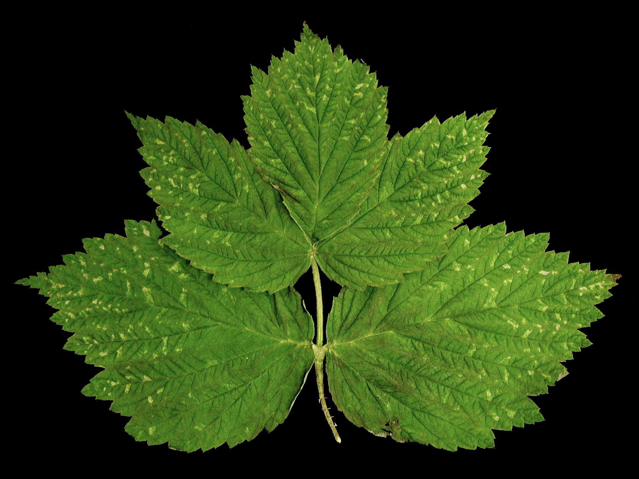 Sur une feuille de framboisier, présence de petites taches translucides blanchâtres et angulaires mesurant moins de 1 mm de diamètre. Les taches sont distribuées de manière irrégulière ou régulière vers le pourtour des folioles. En microscopie, les cellules des feuilles sont turgescentes, mais elles contiennent peu ou pas de chlorophylle. Aucun agent pathogène ni ravageur n'a été détecté des dommages.