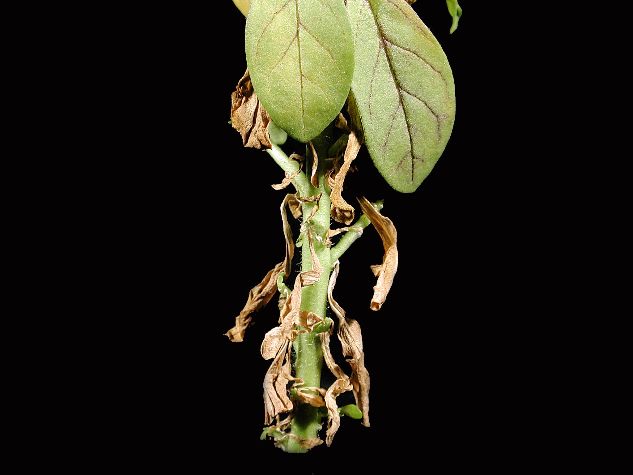 Une vue rapprochée de la partie basale d’un plant de calibrachoa montre des vieilles feuilles complètement dépéries, brûlées et sèches. Les feuilles médianes sont vert pâle à jaunes avec des nervures mauves. Tous les tests de laboratoire se sont avérés négatifs pour la détection de virus, de champignons et de nématodes. Par contre, le pH du substrat est élevé (7,4) tandis que la conductivité électrique est faible (0,6 mS/cm). Le calibrachoa demande un pH se situant entre 5,4 et 6,2 tandis que la conductivité électrique doit se situer entre 2,0 et 3,5 mS/cm.