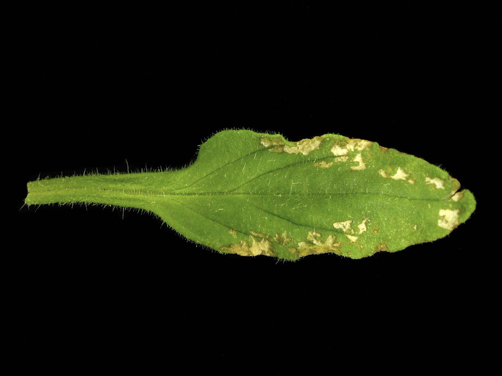 Une feuille médiane de pétunia montre des taches nécrotiques blanches à beiges localisées à la marge et à l’apex. Ces feuilles sont légèrement déformées. De fines taches sont également visibles à la loupe binoculaire et elles ne traversent pas le limbe (pas visible ici). Les tests de laboratoire se sont avérés négatifs pour la détection de virus.