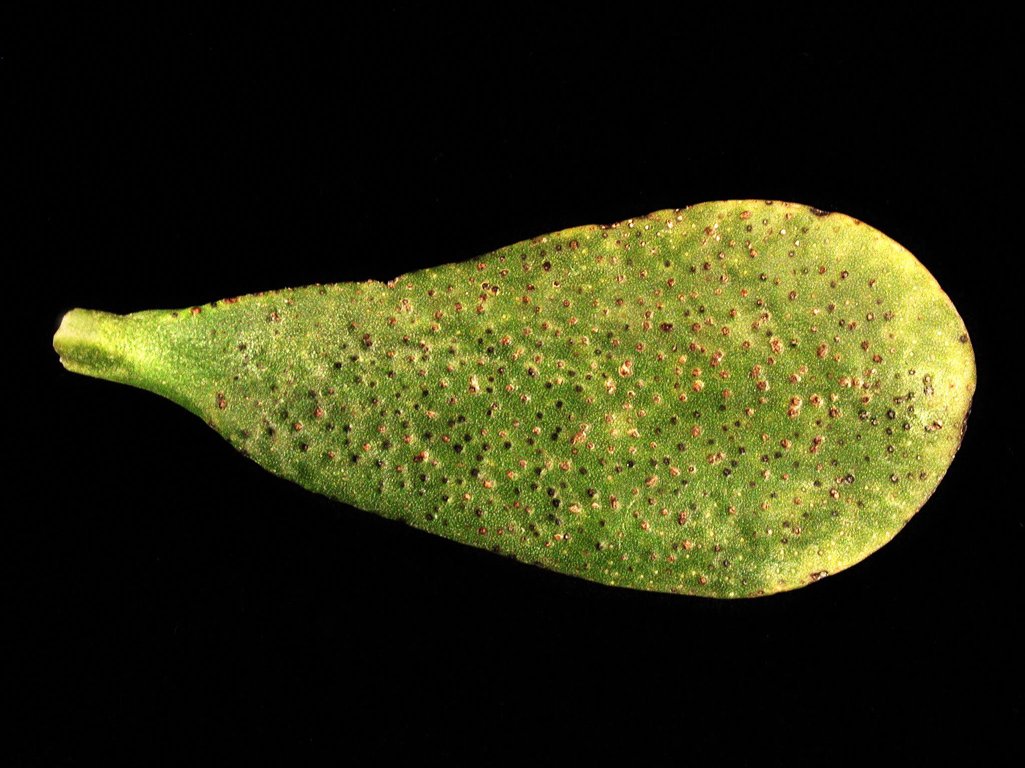 À la face supérieure d’une feuille d’un crassula cultivé en serre, présence de nombreuses petites taches brun foncé, plutôt circulaires, sans halo jaune et d’une apparence liégeuse. Le diamètre des taches est inférieur à 1 mm. Elles sont réparties uniformément sur le limbe. Les nouvelles feuilles sont sans symptôme (non visible ici). Aucun agent pathogène n’a été détecté des dommages. Le résultat des tests de laboratoire et la nature du dommage confirment la présence d'œdème sur la feuille.