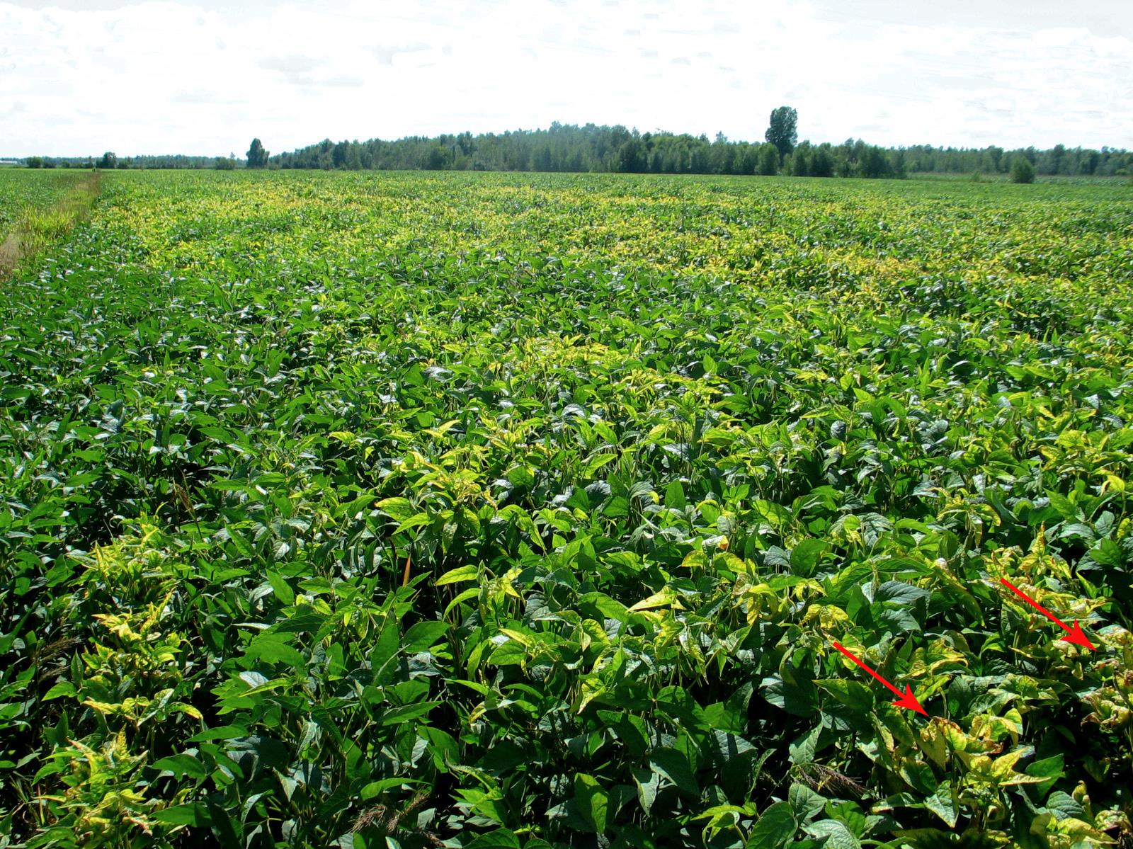 Un champ de soya montre des zones irrégulières où les plants présentent un jaunissement des feuilles terminales et des brûlures marginales (voir flèches). L'analyse de sol et foliaire a révélé une carence en potassium. Les zones carencées avaient en moyenne 60 kg/ha de potasse. Pour la culture du soya, un bon sol doit présenter une teneur en potassium de 200 à 250 kg/ha. L'analyse foliaire a, quant à elle, révélé une teneur en potassium de 0,71 % alors qu'un plant sain devrait avoir une teneur en potassium entre 1,7 et 2,5 %. Ce champ n'avait pas reçu d'engrais l’année de la culture.