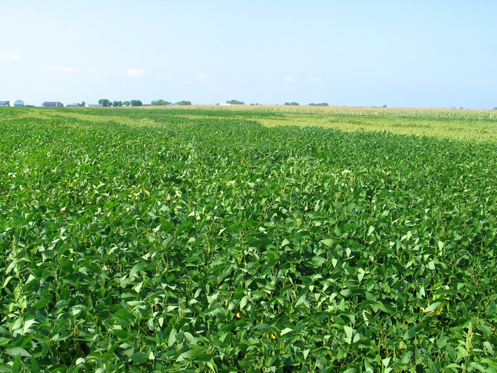 Un champ de soya montre des zones de plants jaunis. Les plants situés au premier plan ont des feuilles flétries et parfois enroulées. Ces symptômes sont causés par le manque d’eau dans le sol occasionné par une très grande sécheresse (2005).