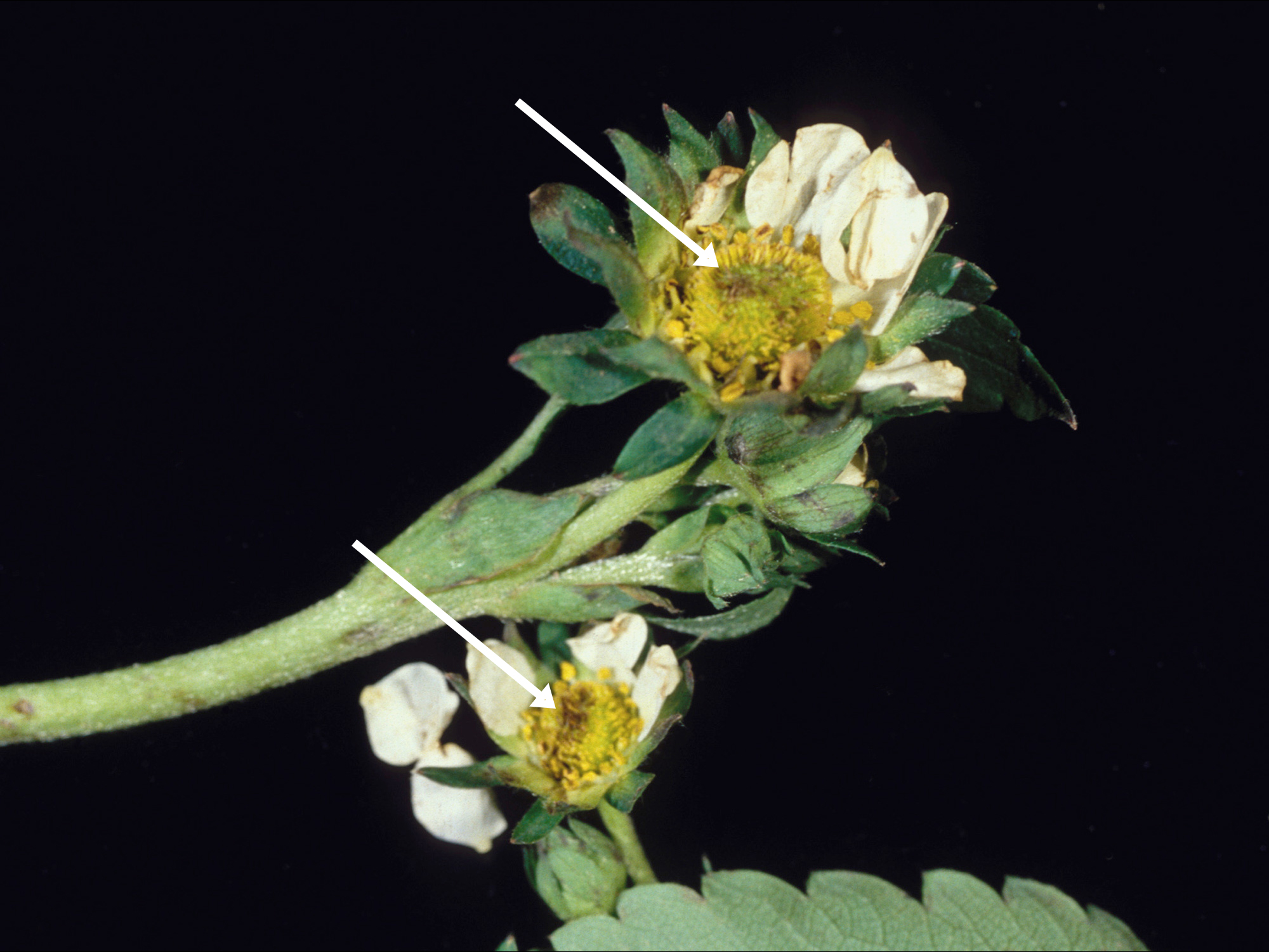 Sur des fleurs de fraisier, présence de taches brunes sur les carpelles (voir flèches). Les taches sont causées par l’impact de la grêle sur les fleurs. Les symptômes ne sont pas évolutifs.